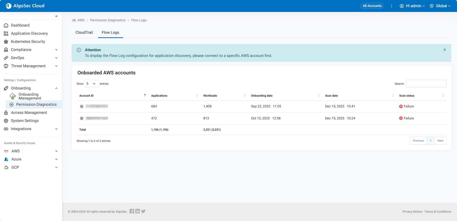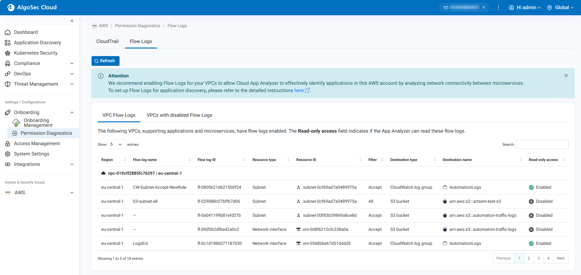 Open the Flow Logs Diagnostics: In Cloud App Analyzer, go to Settings / Configurations > Onboarding > Permissions Diagnostics > Flow Logs.