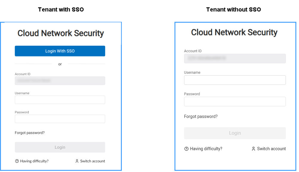 If you have multiple tenant IDs, you can switch between your accounts by clicking Switch account to access the Account Login window and enter the Account ID.