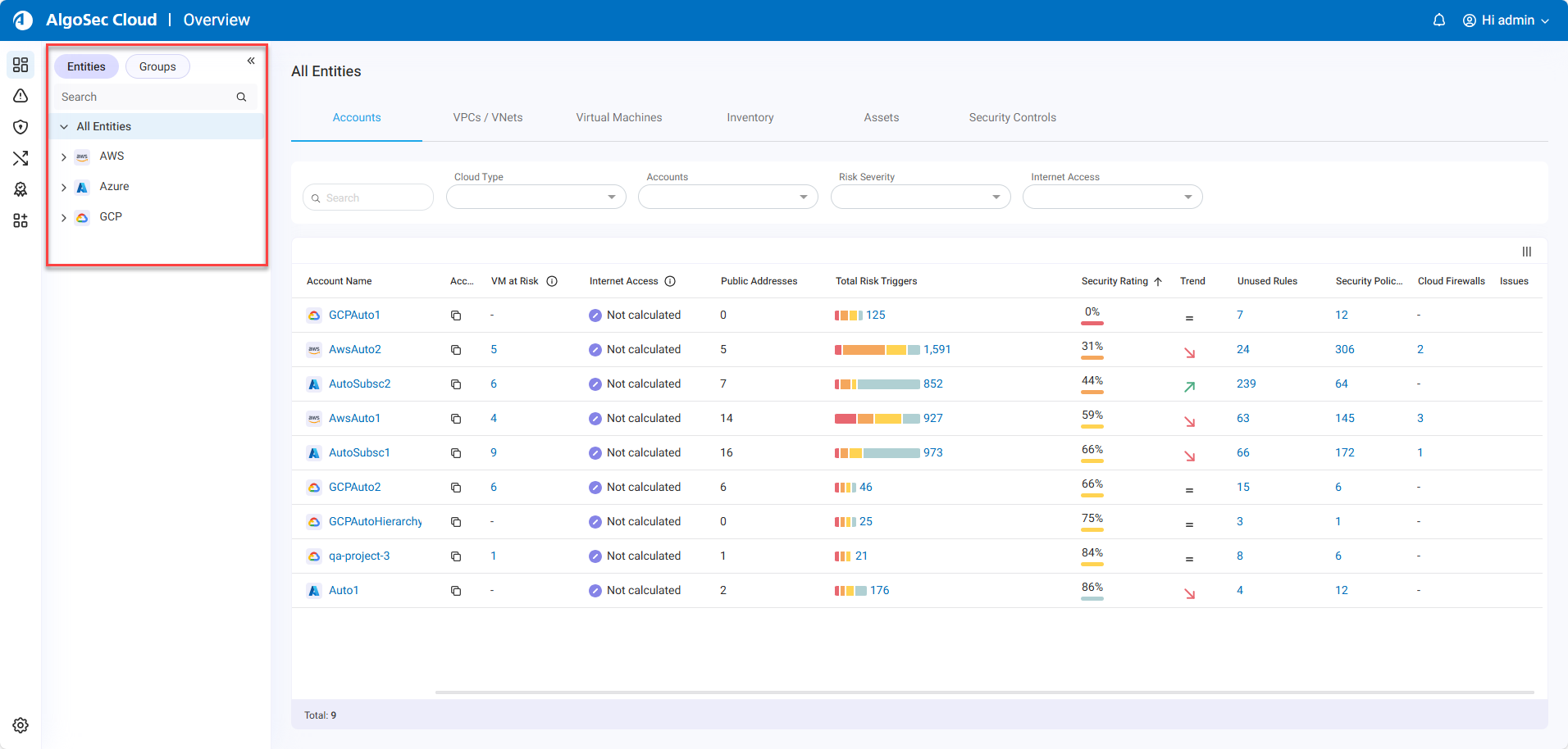 Entities Tree: Displays individual accounts organized by vendor.