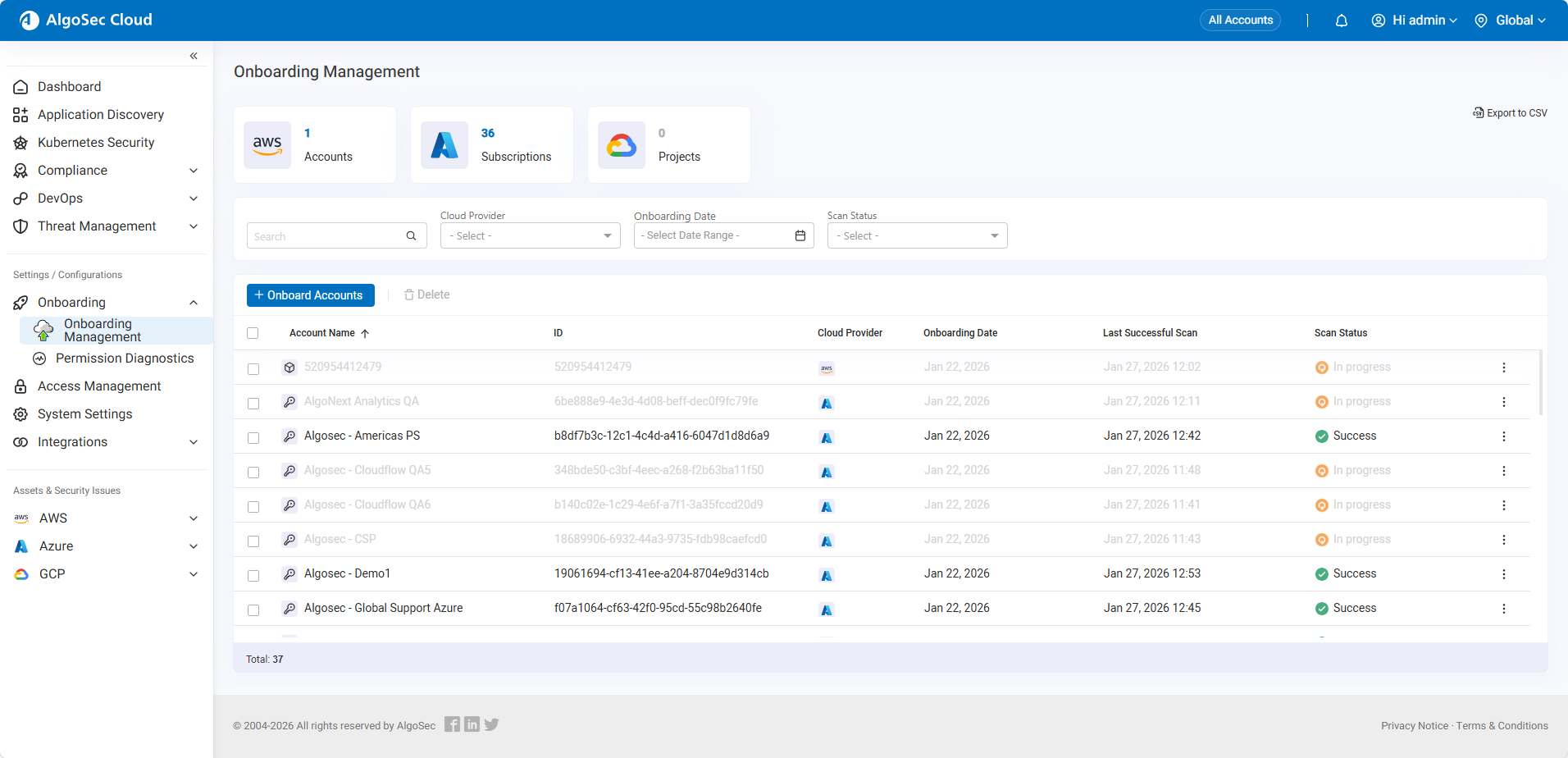 This topic describes how to onboard and manage cloud accounts in AlgoSec Cloud Enterprise, including Azure subscriptions, AWS accounts, and Google Cloud projects.