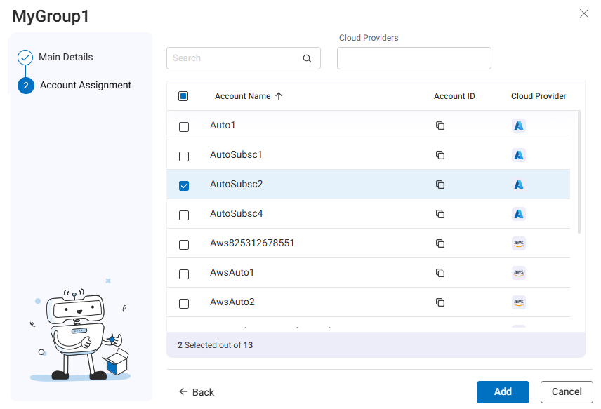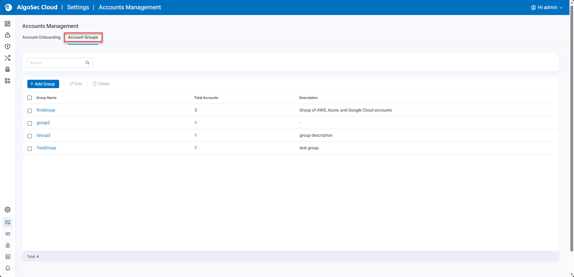 Use the Accounts Management page Account Groups tab to create and manage groups of cloud accounts.