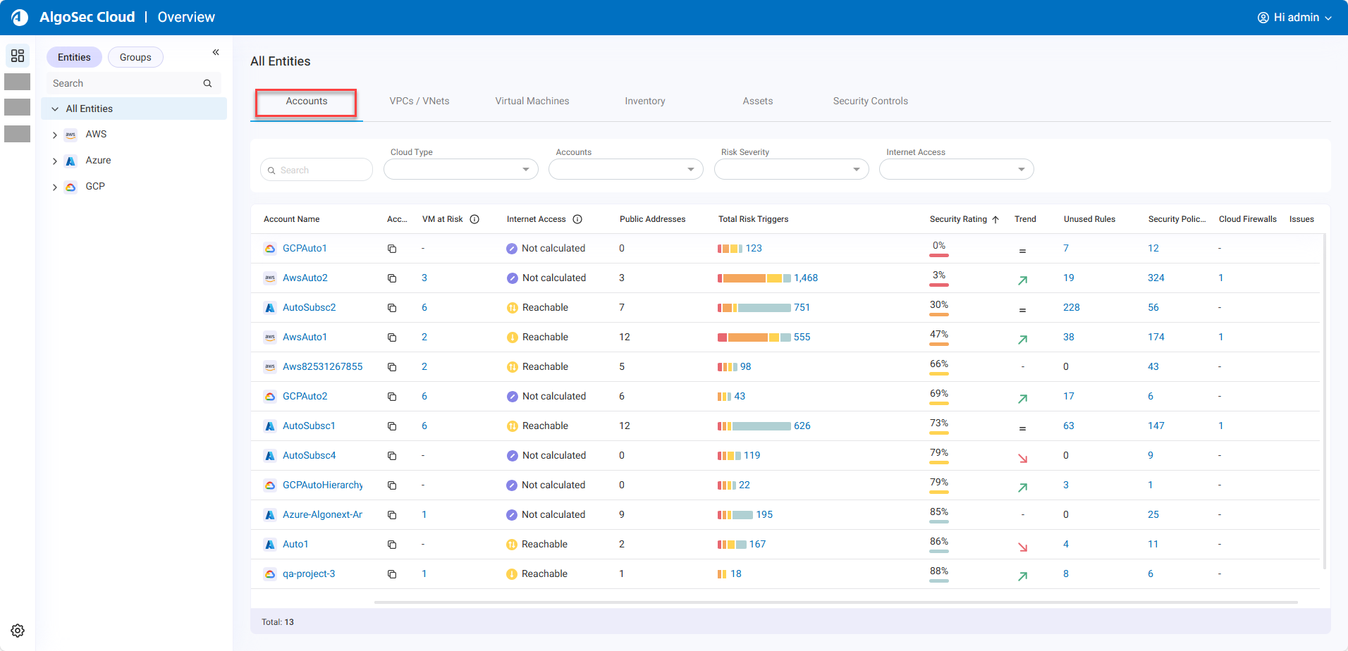 Use the Accounts, VPCs / VNets, Virtual Machines, Inventory, Assets, and Security controls tabs in combination with the selected entity or account group in the Navigation Tree and filter options for a targeted view of the managed accounts, the protected assets, and the security controls.