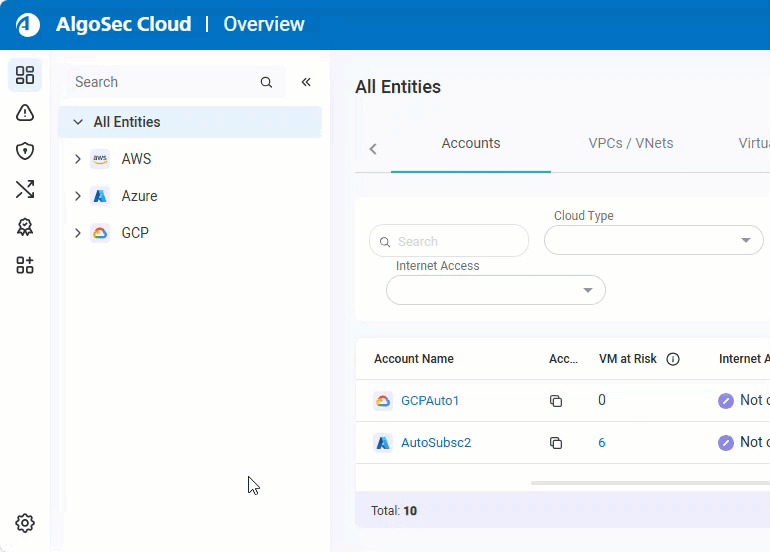 Describes the process of adding and managing Azure subscriptions, AWS accounts, and Google Cloud projects in Cloud Network Security. For more details on onboarding cloud accounts, see: |