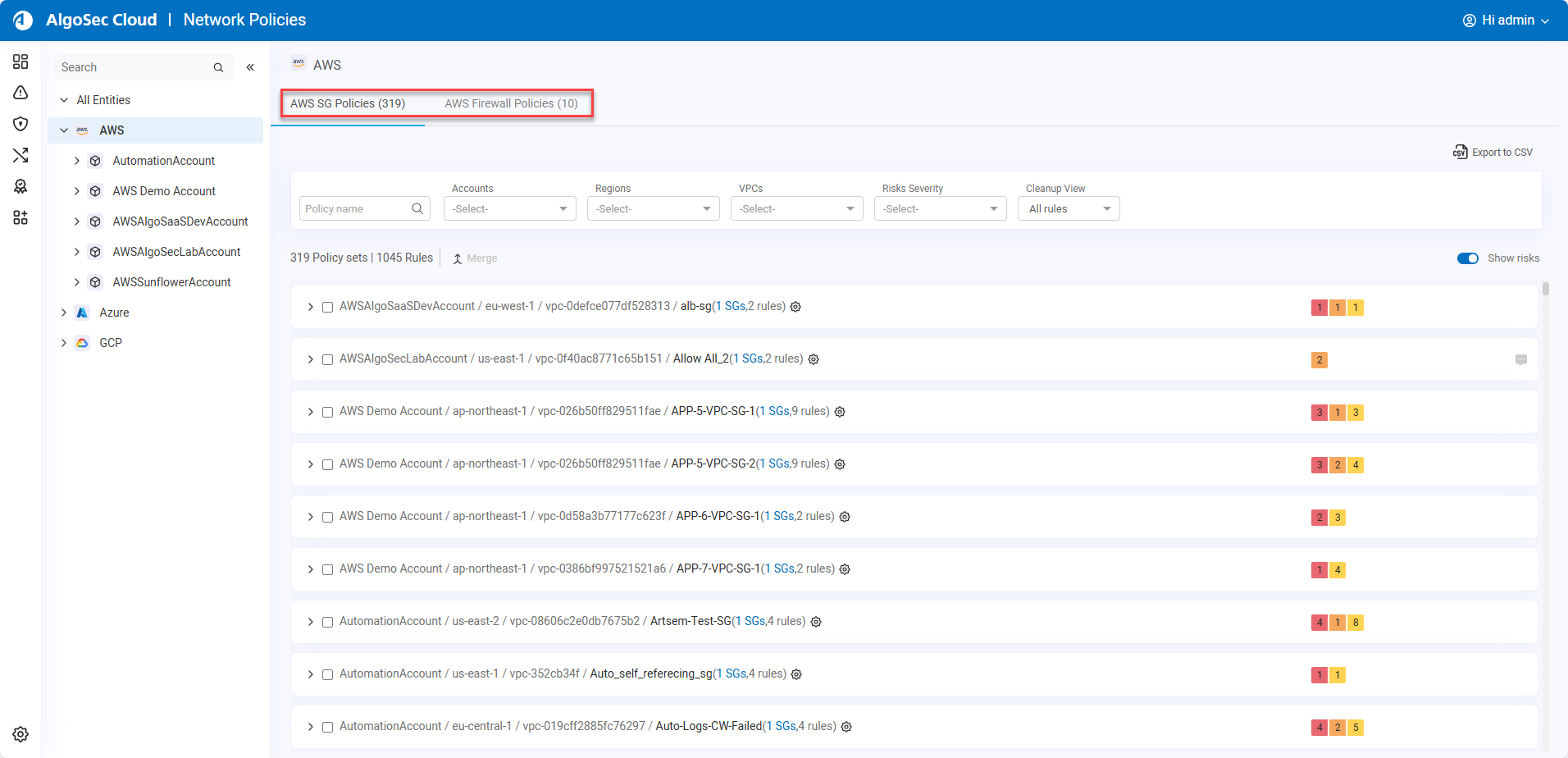 AWS policies include two tabs: AWS SG Policies and AWS Firewall Policies.