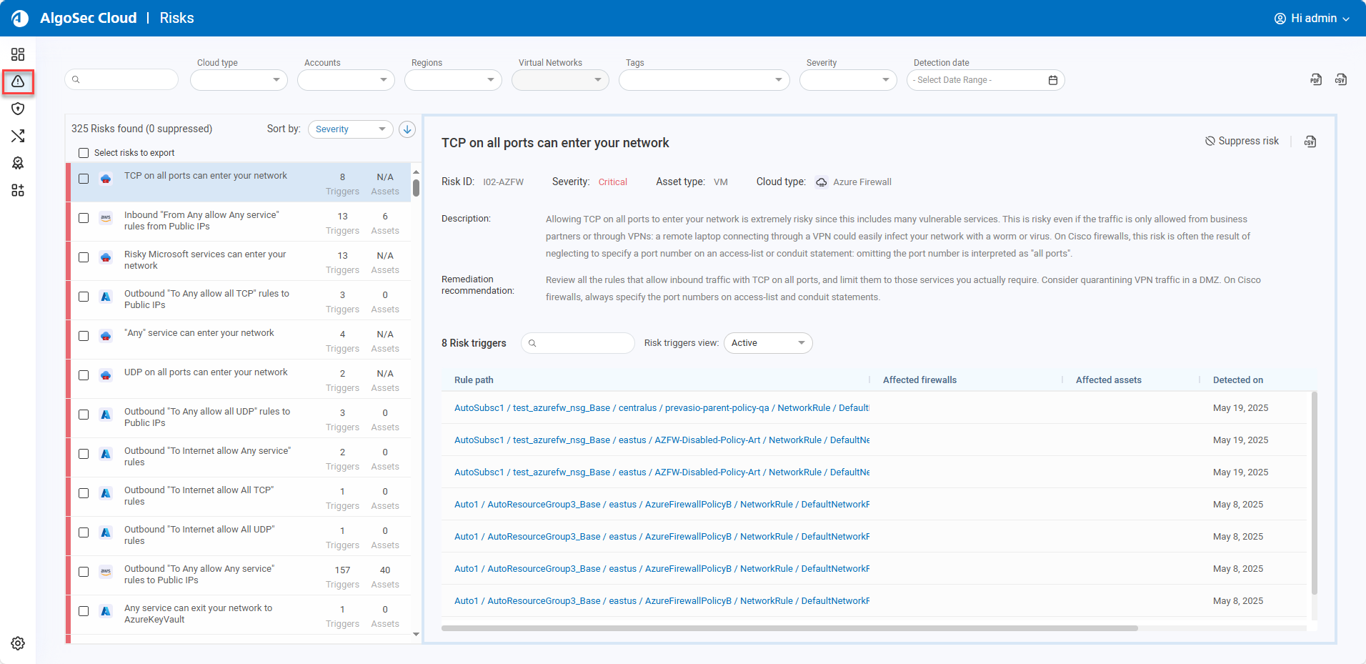 The Risks page provides information on risks across all your on-boarded cloud accounts (such as AWS, Azure, and Google Cloud). From it, you can explore, activate, and suppress whole risks or risk triggers, export risk trigger details, identify affected assets, access rules in the context of their policies , and create risk reports.