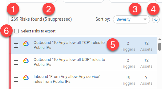 Cloud type The cloud type of the account the risk was found in. Risk name A short description of the risk. Triggers The number of rules that trigger the risk. Affected assets