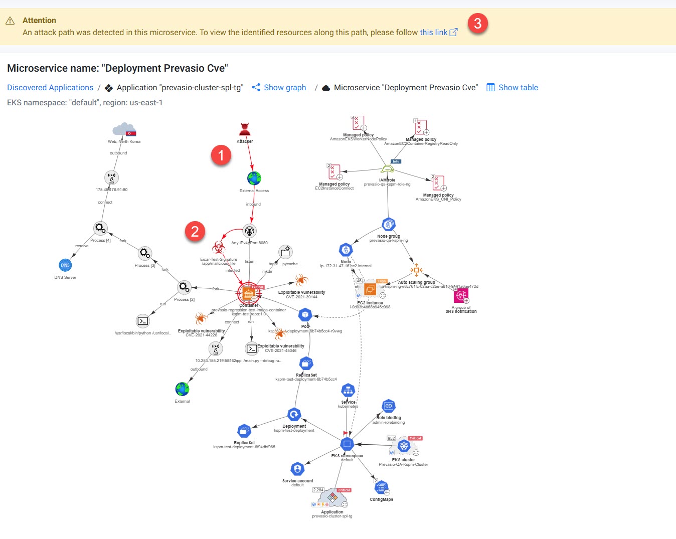 The attack path always ends at the highest-impact service the attacker could reach through the compromised instance.