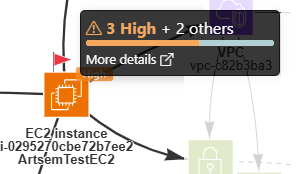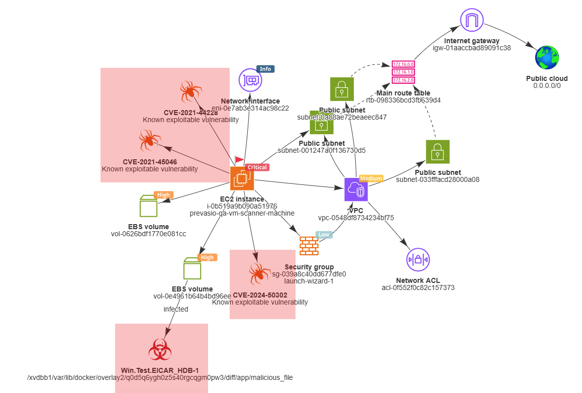 This graph details the application’s structure and highlights elements with security issues, offering a view of the complex relationships within the cloud environment. By showing where vulnerabilities occur within the application, this visual tool helps prioritize security issues based on their placement and impact.
