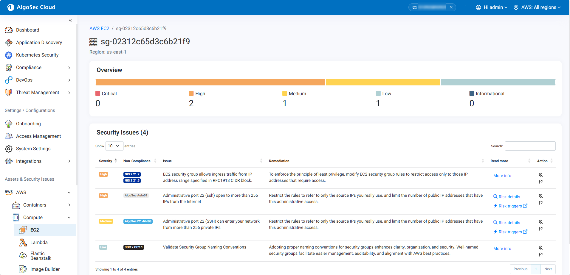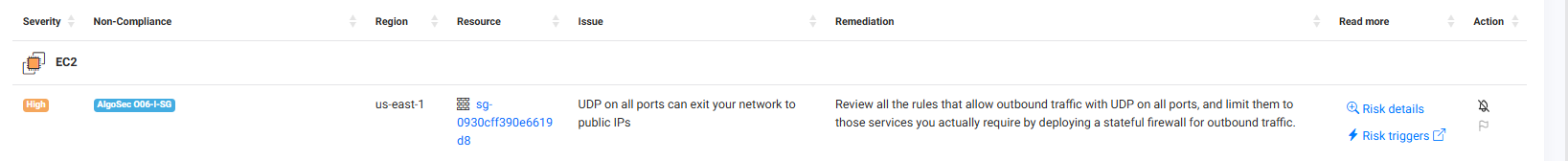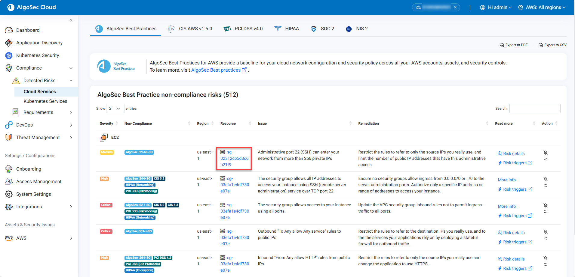 AlgoSec Best Practices represents an internally established compliance standard tailored for violations, particularly focusing on networking risks. To read more, see Manage Networking Risks in Cloud App Analyzer. |