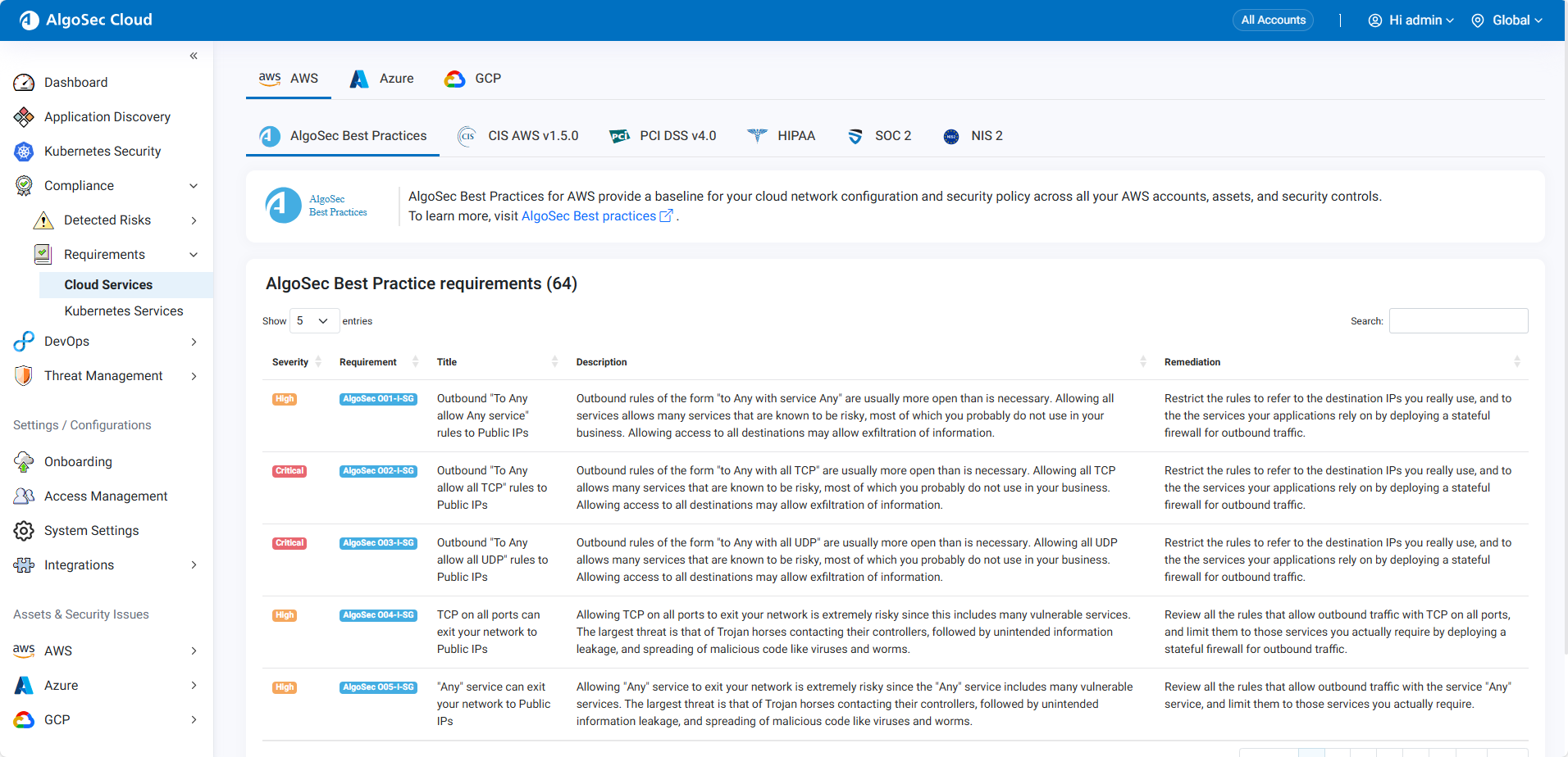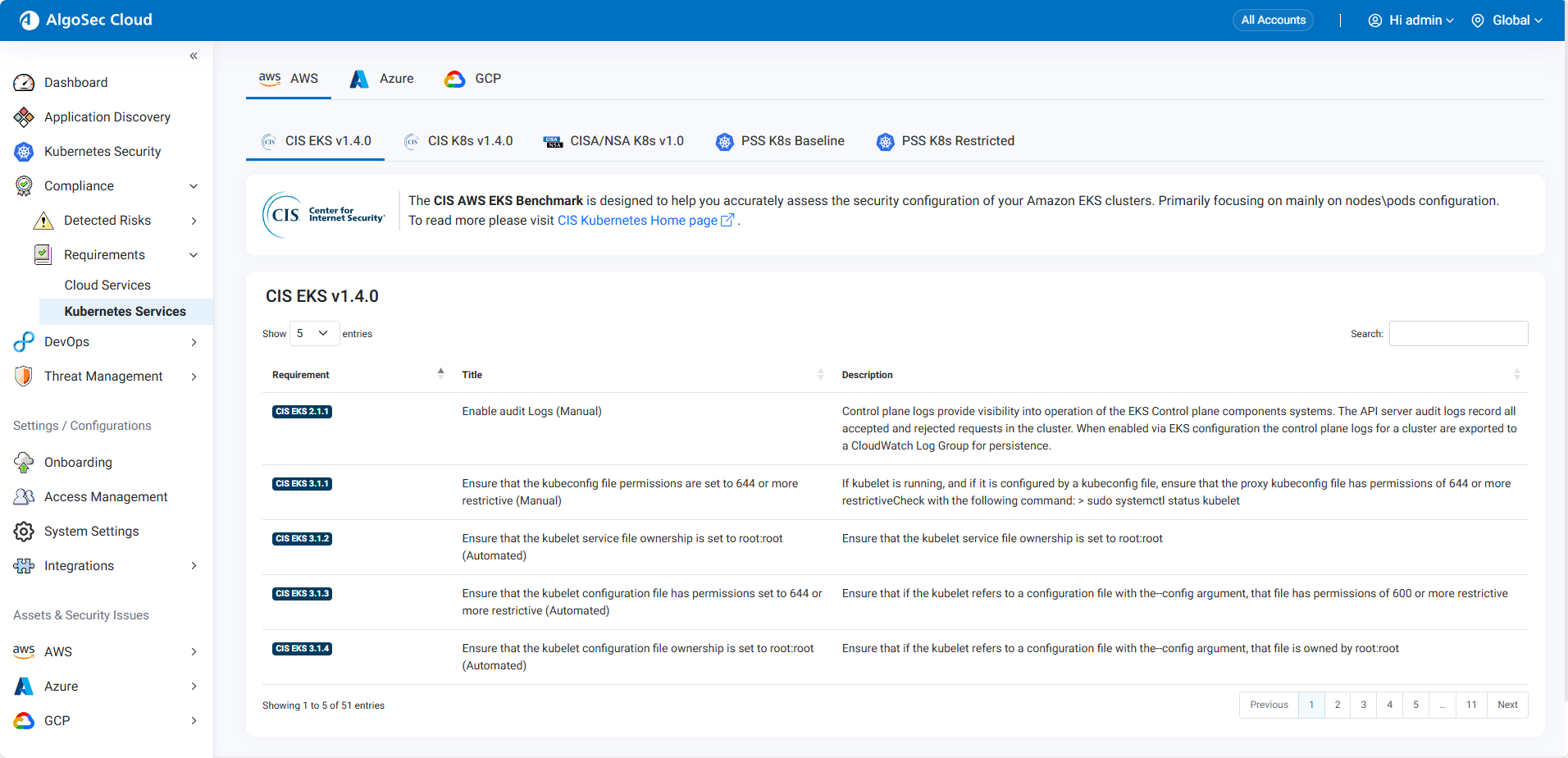 From the Cloud App Analyzer Main menu click Compliance > Requirements > Kubernetes Services.