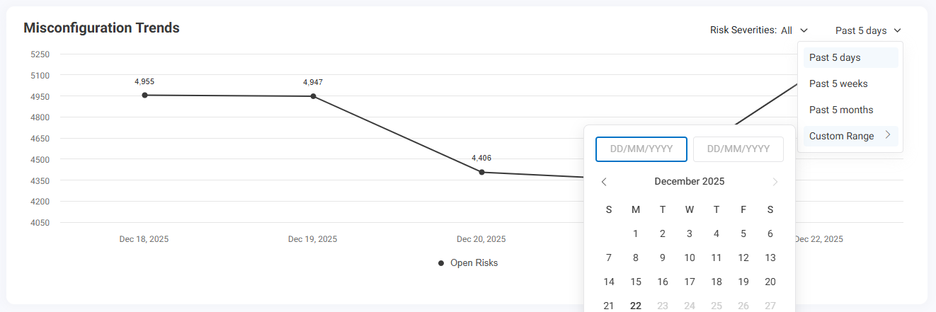 The Misconfiguration Trends graph displays both regressions and progress in resolving configuration and compliance issues for the account over time, enabling ongoing monitoring of your security posture's evolution and trends.