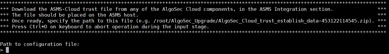 When prompted for the path of the configuration file, enter: /root/AlgoSec_Upgrade/AlgoSec_Cloud_trust_establish_data-{tenant ID}.zip