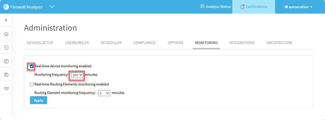 Set the Monitoring frequency to the interval of time in minutes at which AFA should monitor devices.