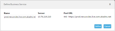 The Define Business Service dialog is displayed, displaying your selections with their default name from the name column.