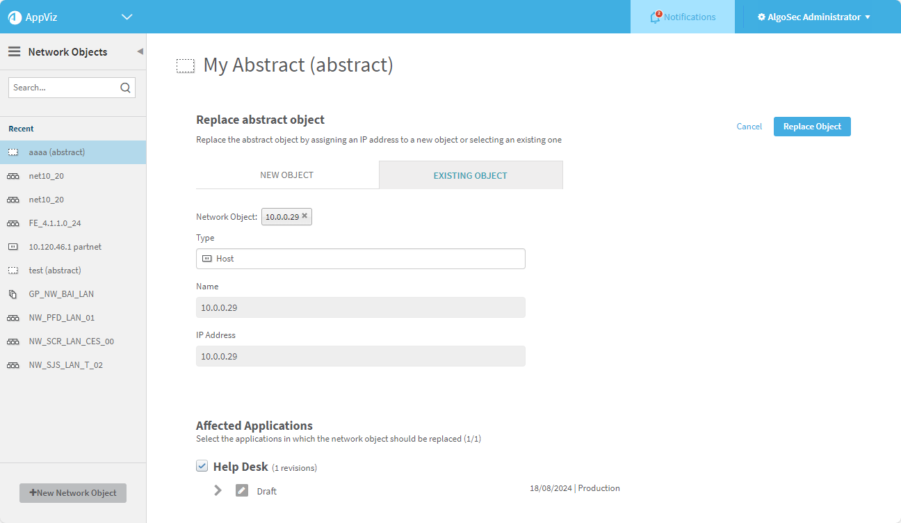 Note: The history of deleted network objects can be viewed in the activity logs. For details, see Network object activity logs.