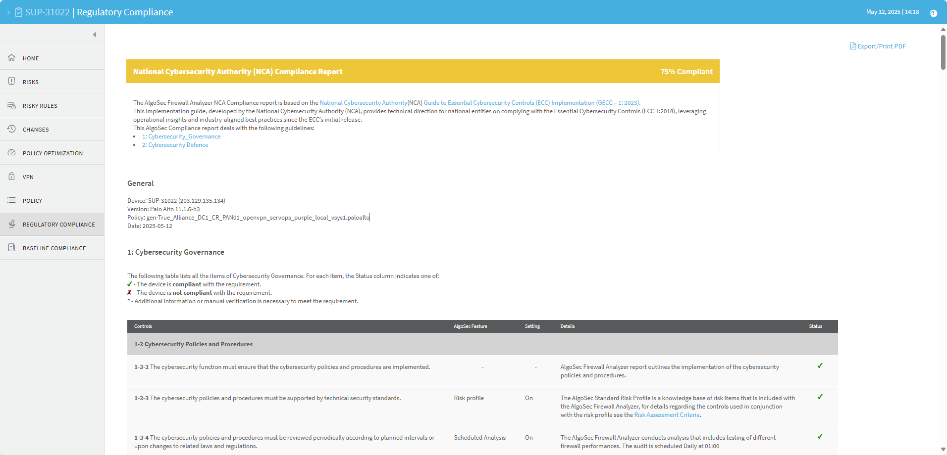The REGULATORY COMPLIANCE page includes a number of reports that describe how compliant your security policy is to specific regulatory standards.