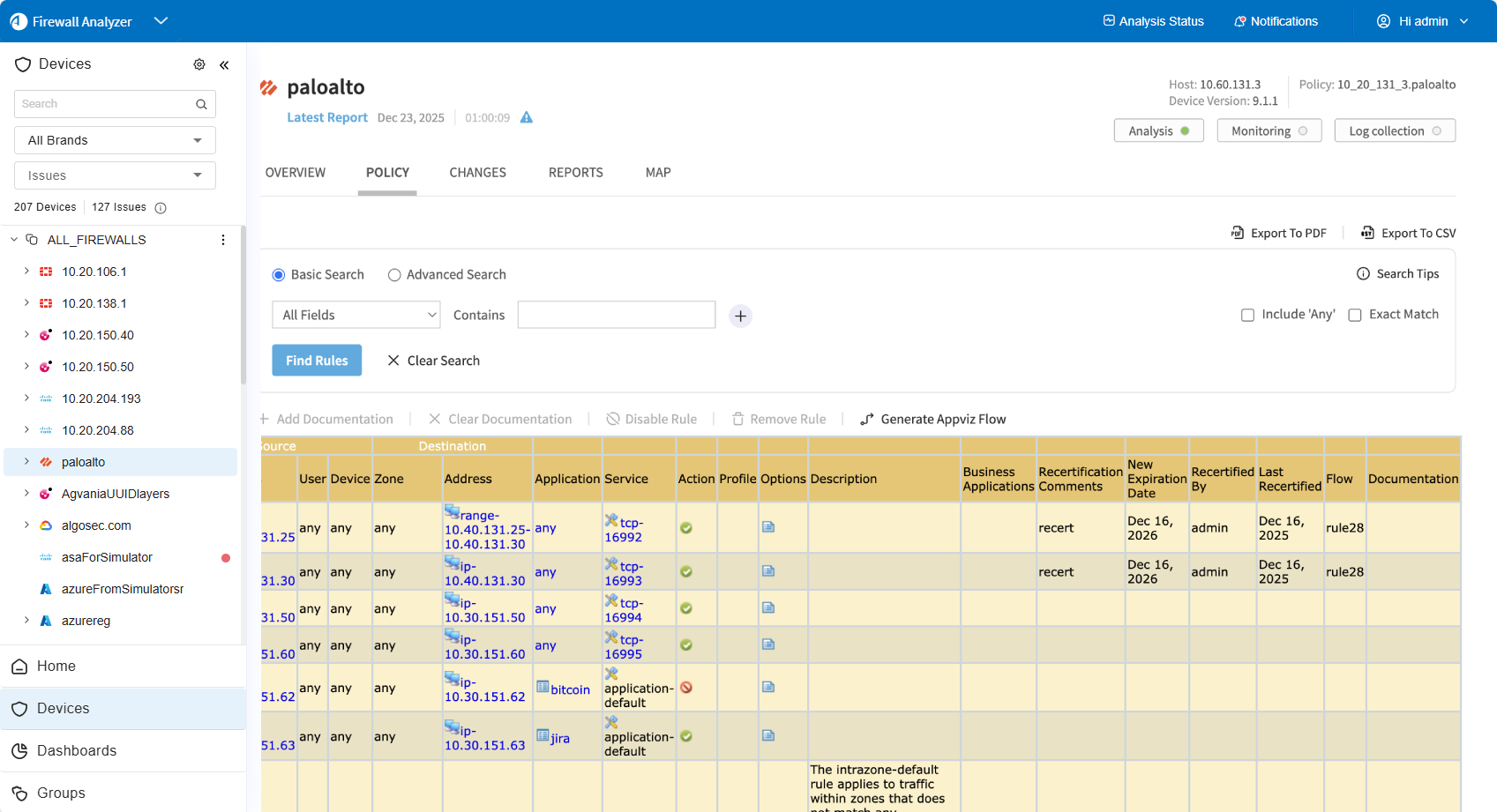 For AppViz , you can also view flow recertification information for policy rules.