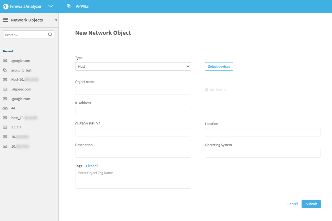 Click +New Network Object located at the bottom-left in the AppViz Network Objects area.