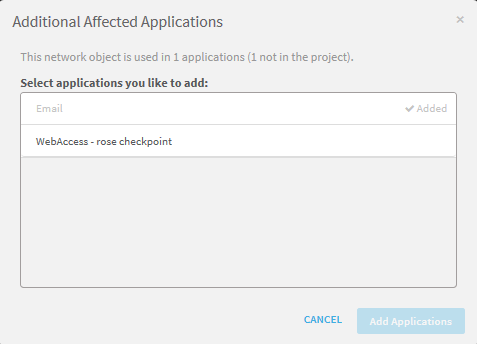 Note: Adding additional applications may result in additional network objects with affected applications not in the project.