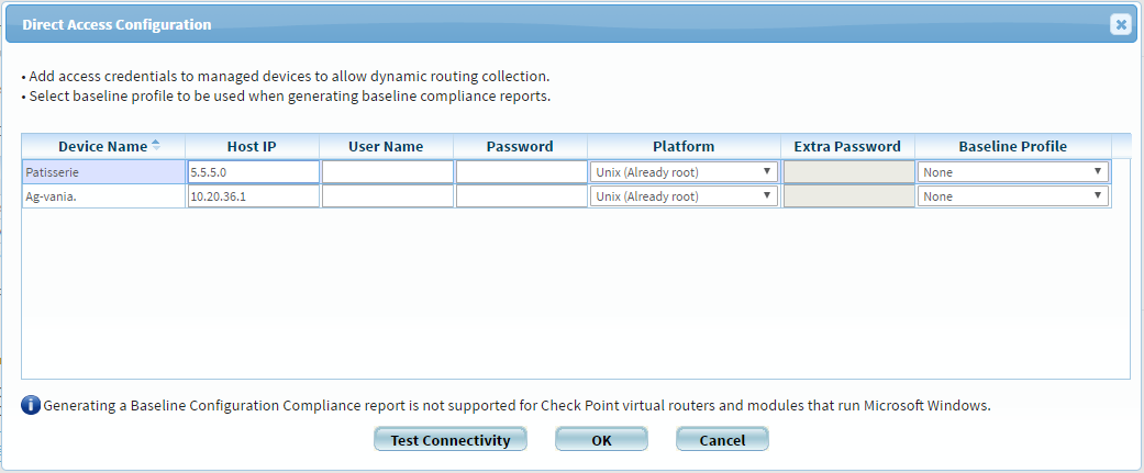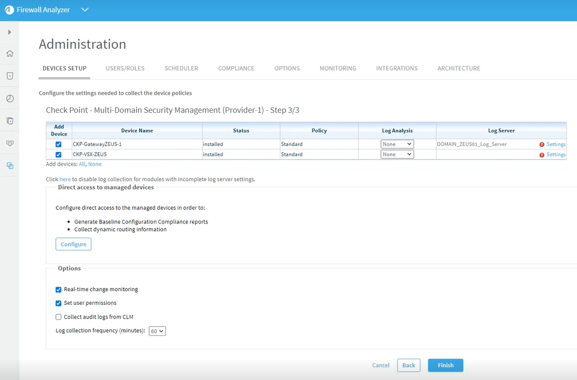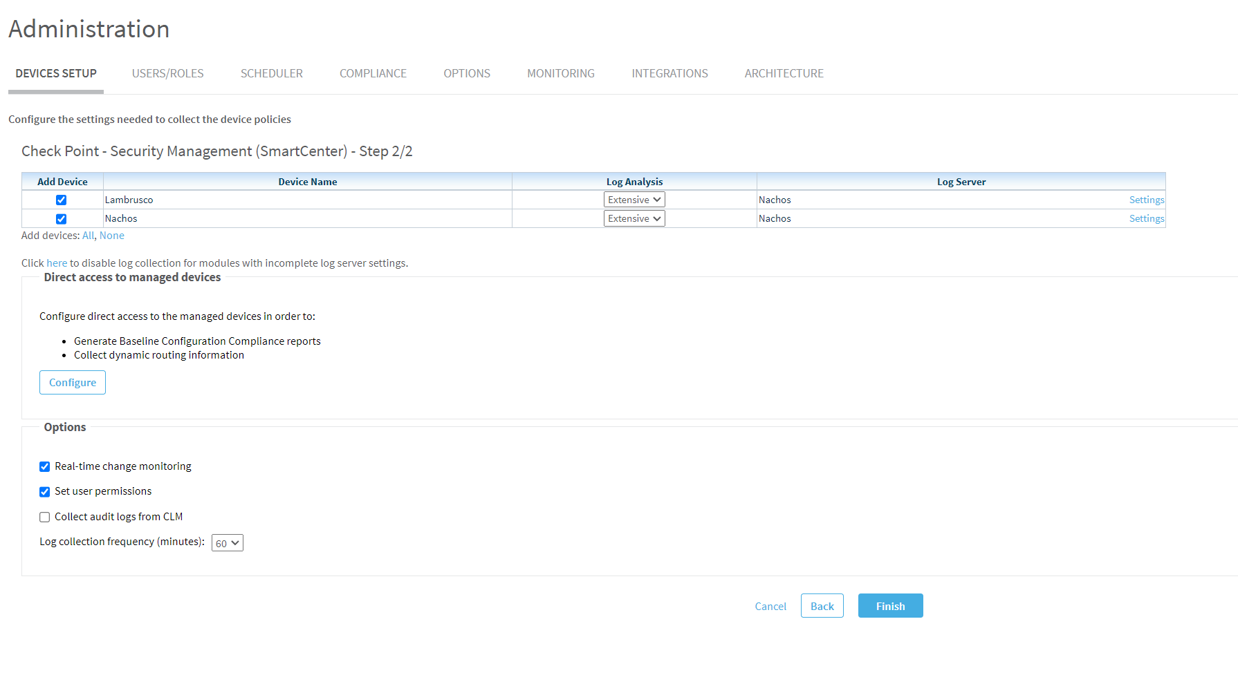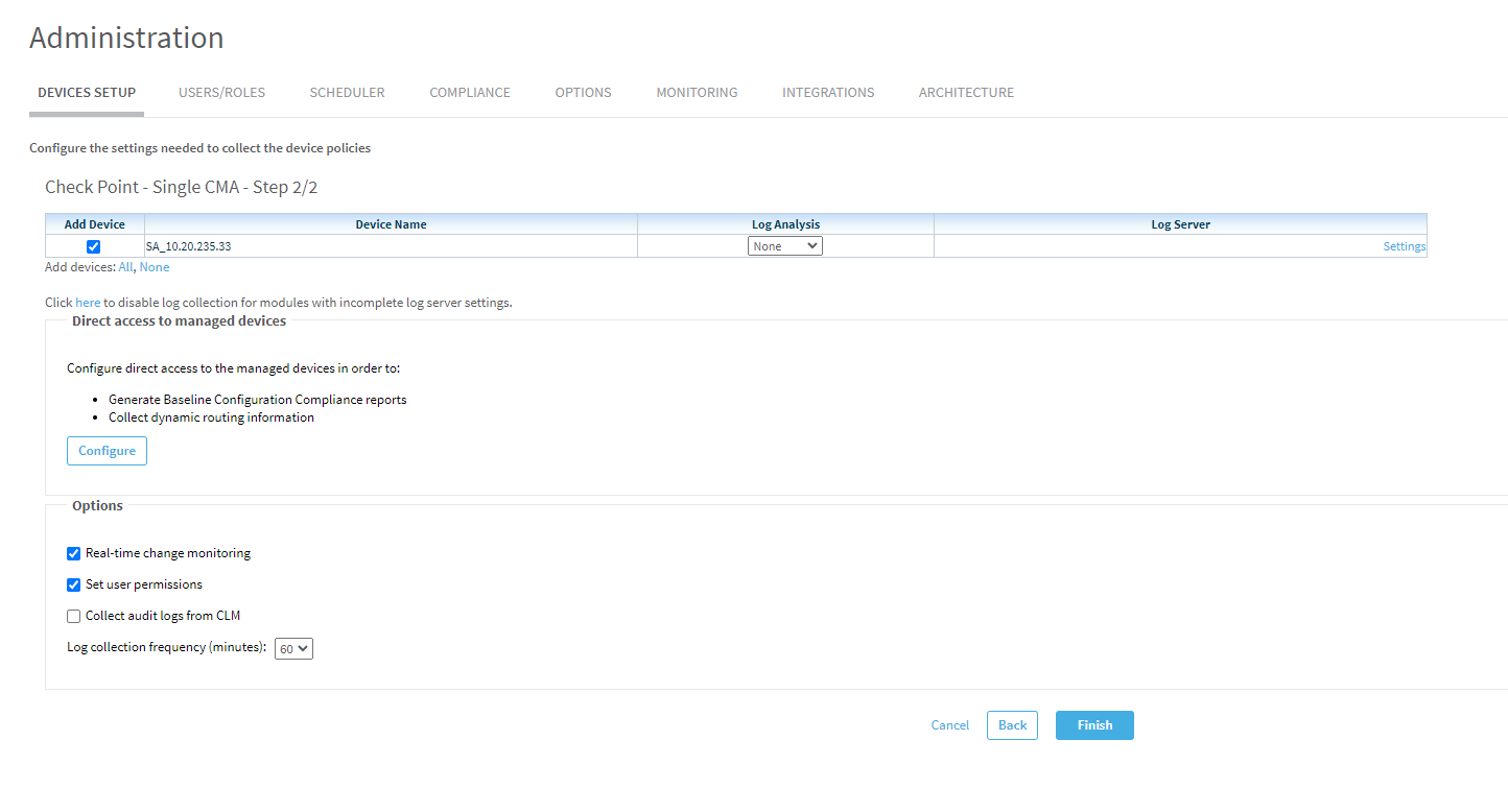 Note: You must also perform procedures on your devices, depending on how you connect to the device from AFA. For details, see Enable data collection for Check Point devices.