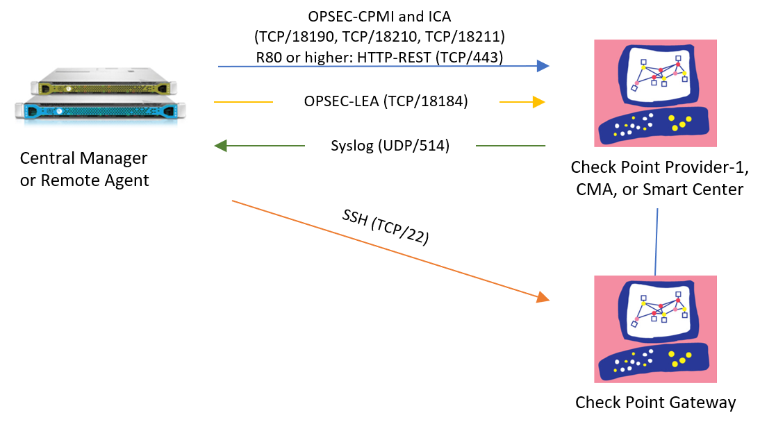 The following diagrams shows an ASMS Central Manager or Remote Agent connecting to a Check Point MDS, CMA, or Smart Center device, and a Check Point Gateway. Check Point versions R80 or higher have an additional connection via HTTP-REST