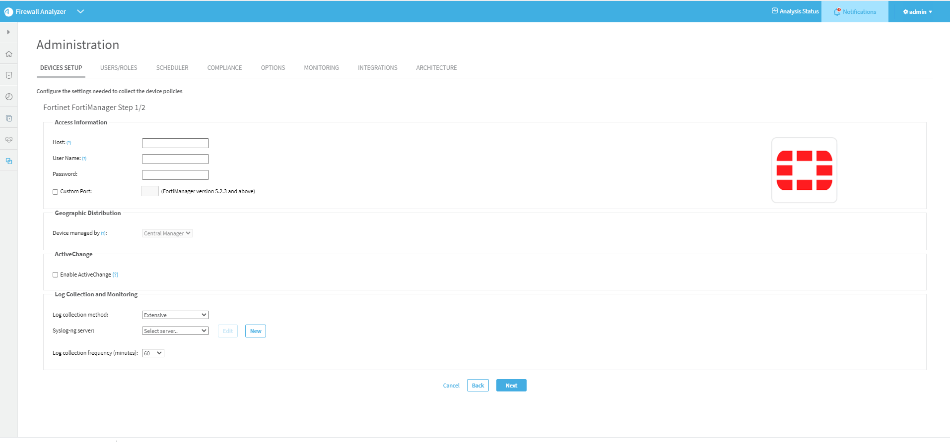 2. In the vendor and device selection page, select Fortinet > FortiManager.