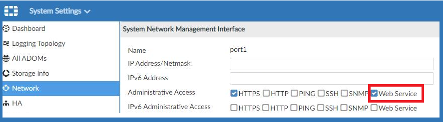 10. Enable the relevant API in the FortiNet FortiManager device.