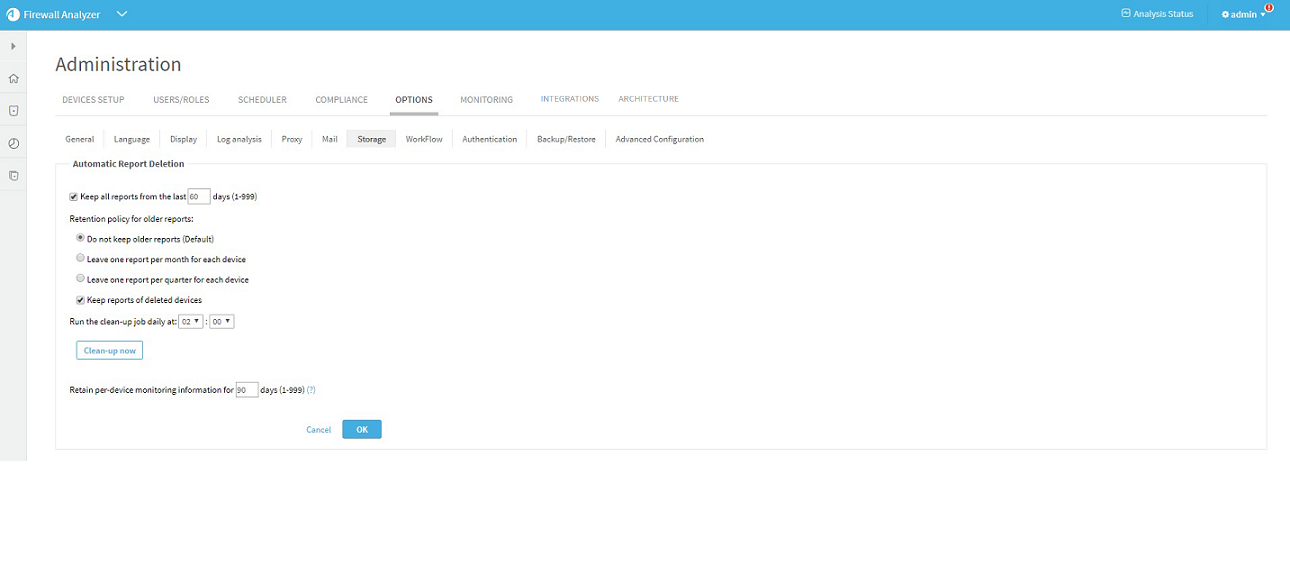 Select this checkbox to enable automatic deletion of reports older than a specified number of days, then type the number of days for which reports should be retained. Older reports will be deleted during clean-up. Note: You must select this checkbox i to select one of the Retention Policies for Older Reports and to determine if reports of deleted devices should be kept.