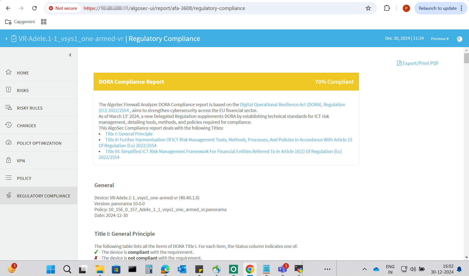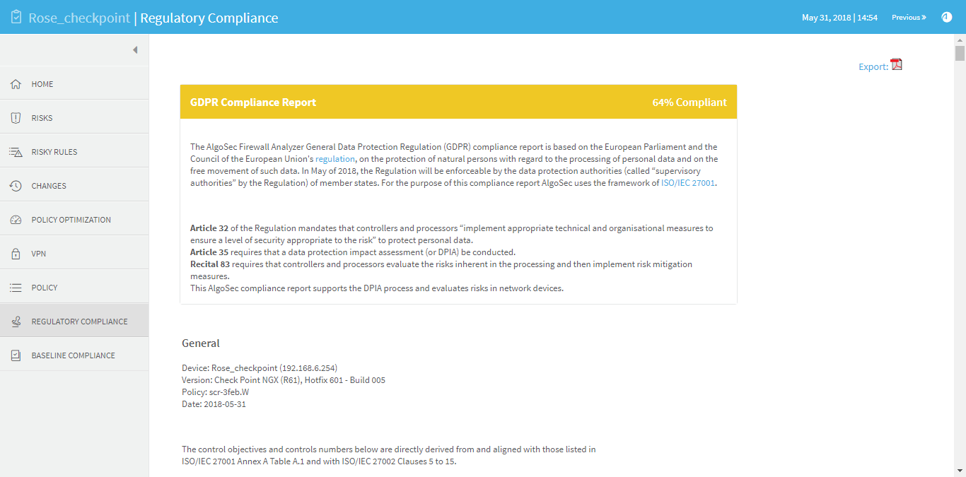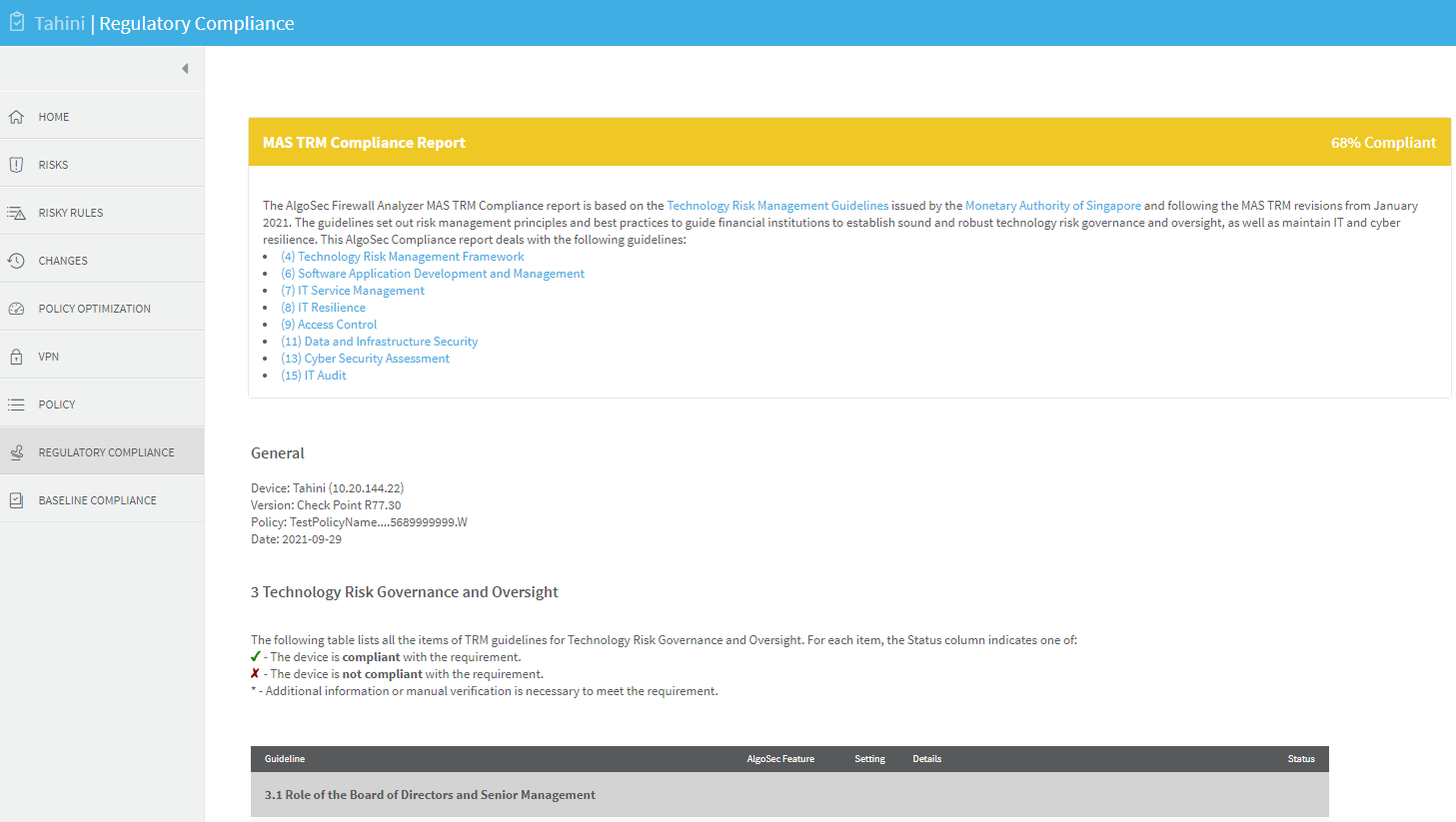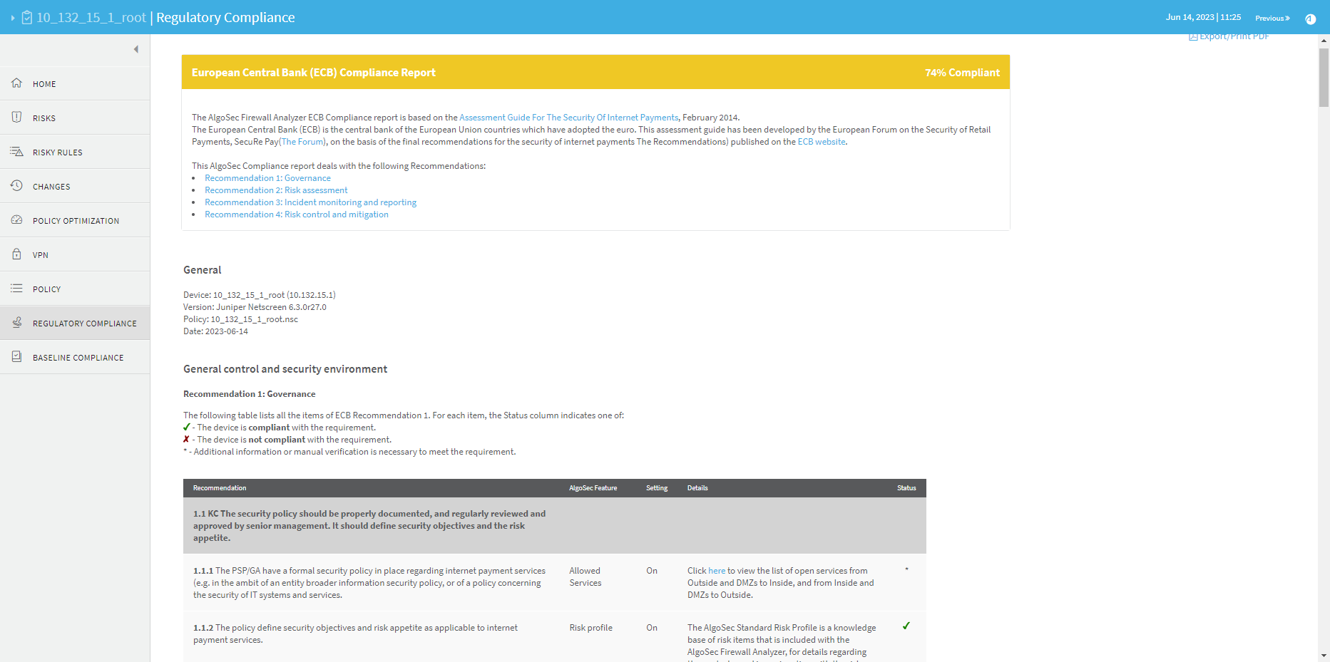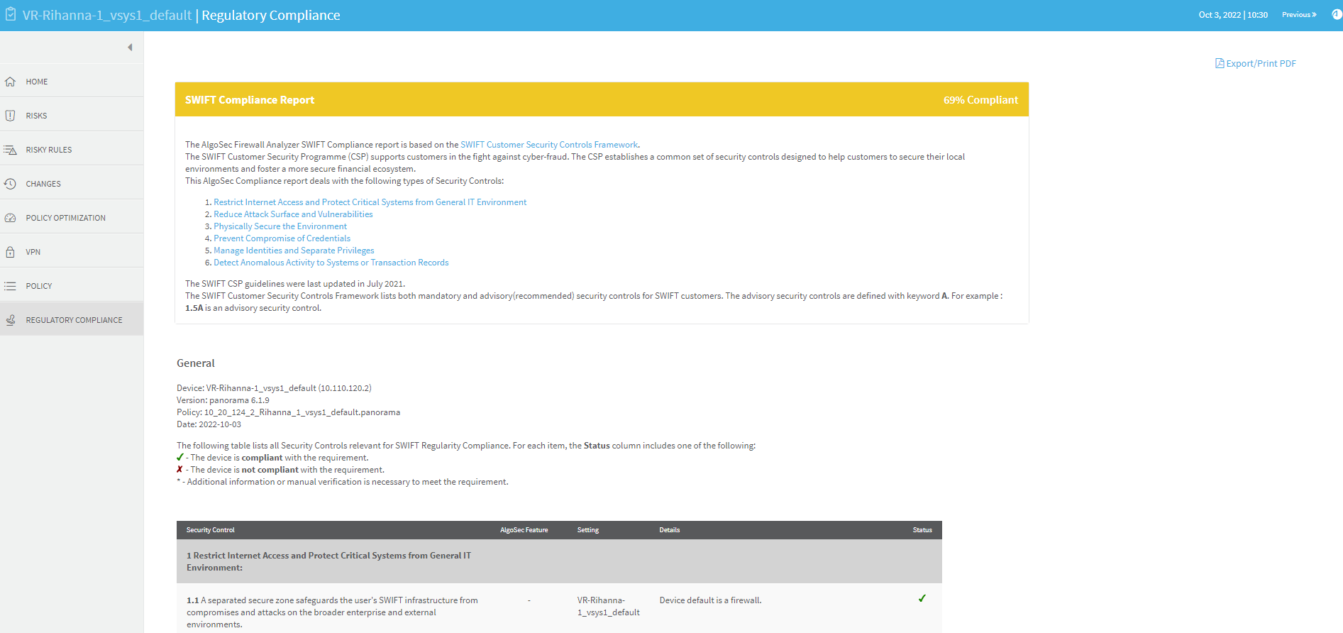 The Regulatory Compliance page provides the following regulatory compliance reports: