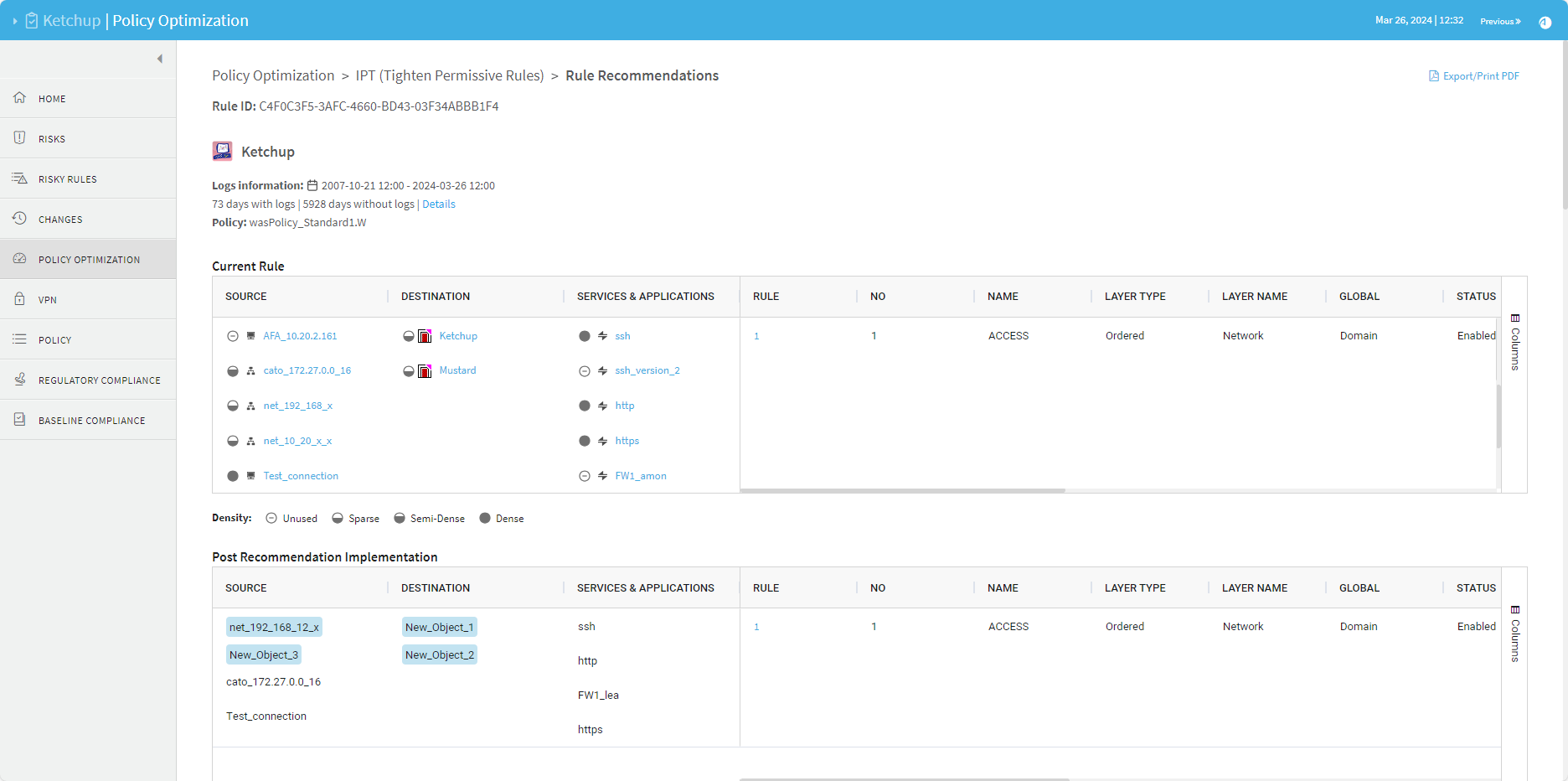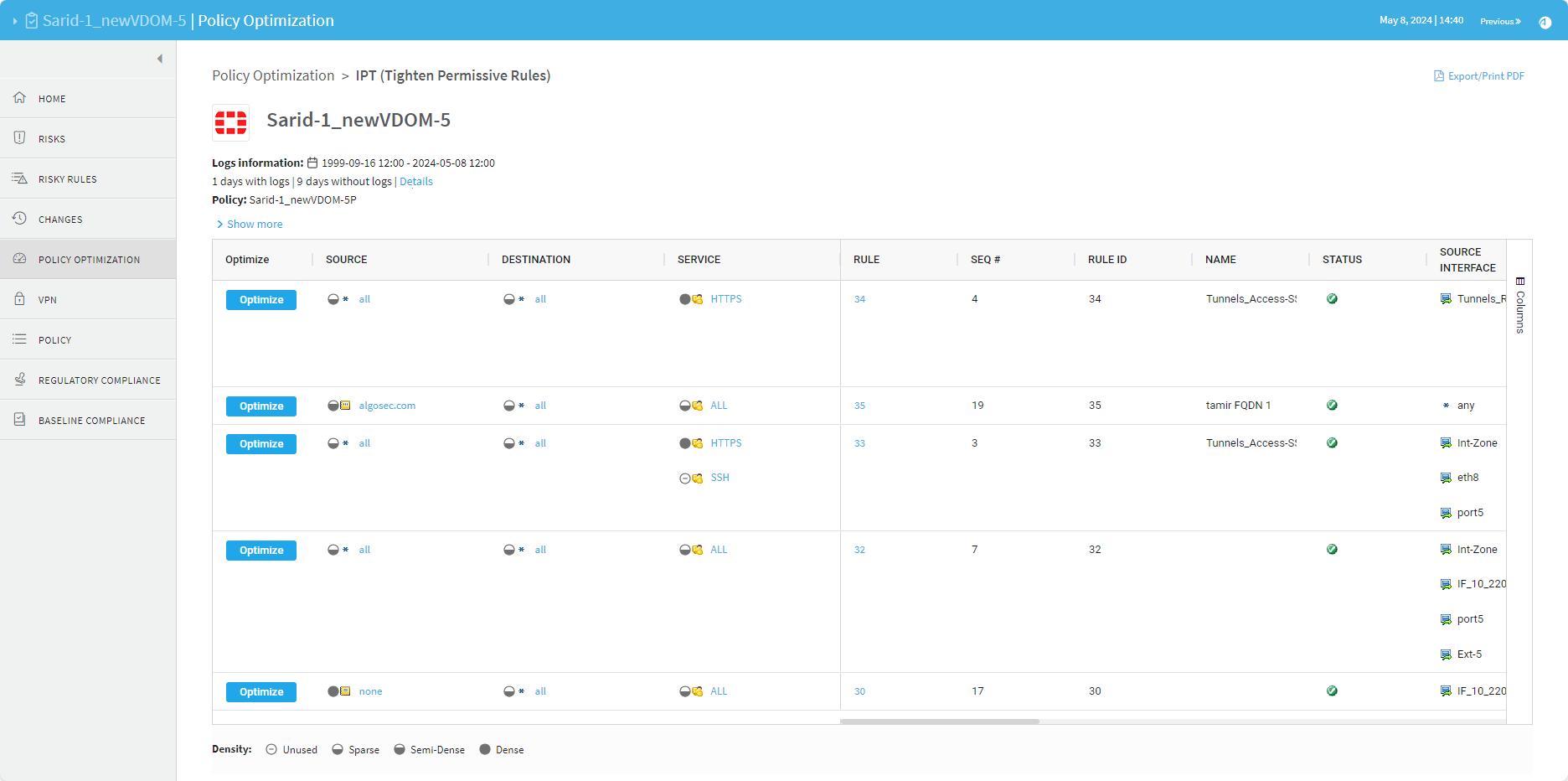 The Intelligent Policy Tuner (IPT) enables you to refine your policy, by identifying rules that are too wide and permissive, and rules which contain sparsely used and unused objects. It also provides recommendations for replacing permissive rules with new, tighter rules. See Refining Rules via the Intelligent Policy Tuner.