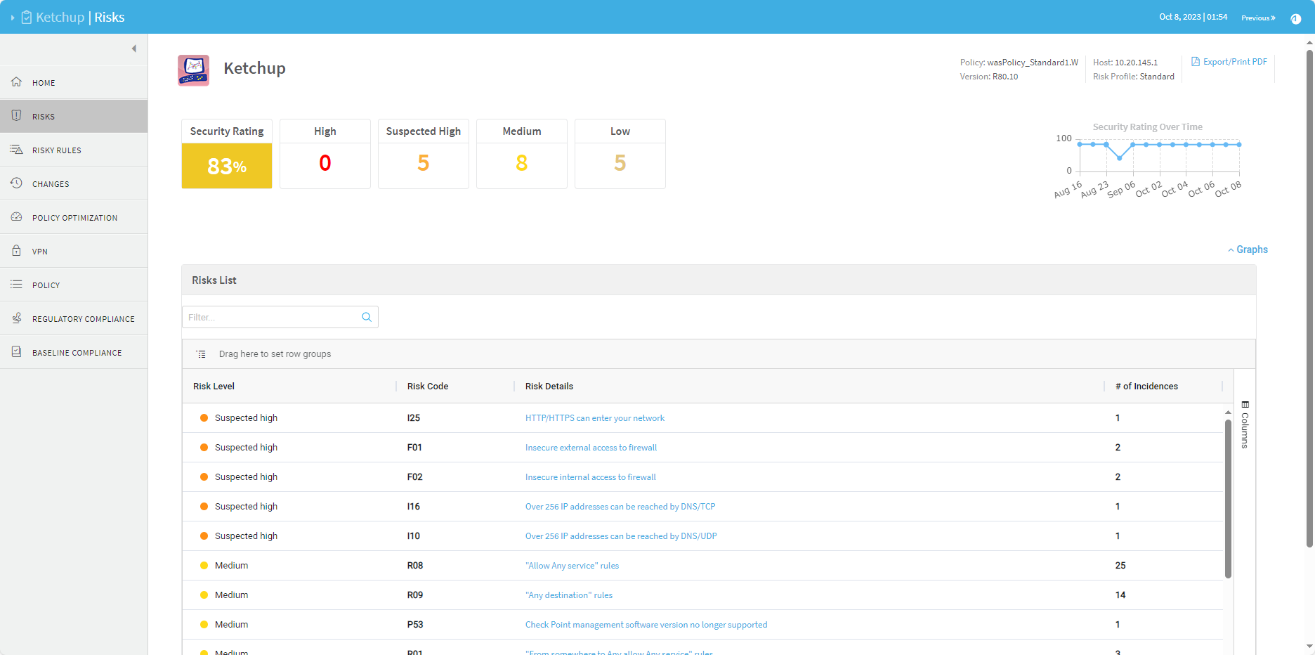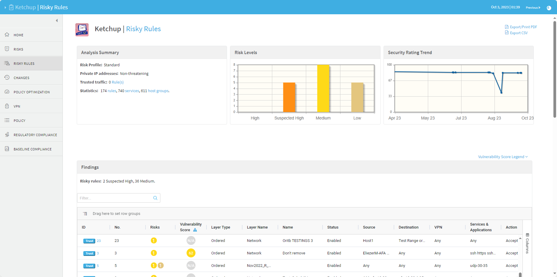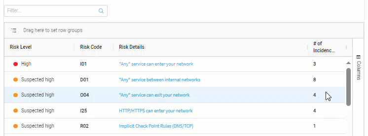 The RISKY RULES page shows the rules that pose risk to the policy. As opposed to the RISKS page which shows the risks triggered by risky policy rules, the RISKY RULES page details the rules that cause these risks.