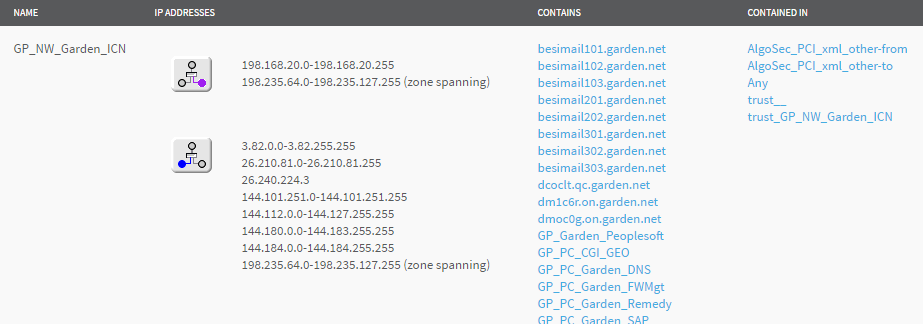 Hostgroup Definitions Provides an index of all Host Groups that are defined by the device or generated by queries. Each Host Group record shows the IP address ranges it contains, any DNS names available, the interfaces on which its IP addresses can be found, and any other Host Groups that are its subsets or supersets.
