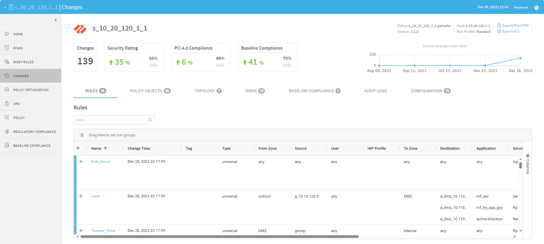 The CHANGES page provides detailed information about changes to the device, over the whole history of AFA reports for the device. Reports include all change monitoring supported for real-time change monitoring as well as changes to risks and baseline compliance.