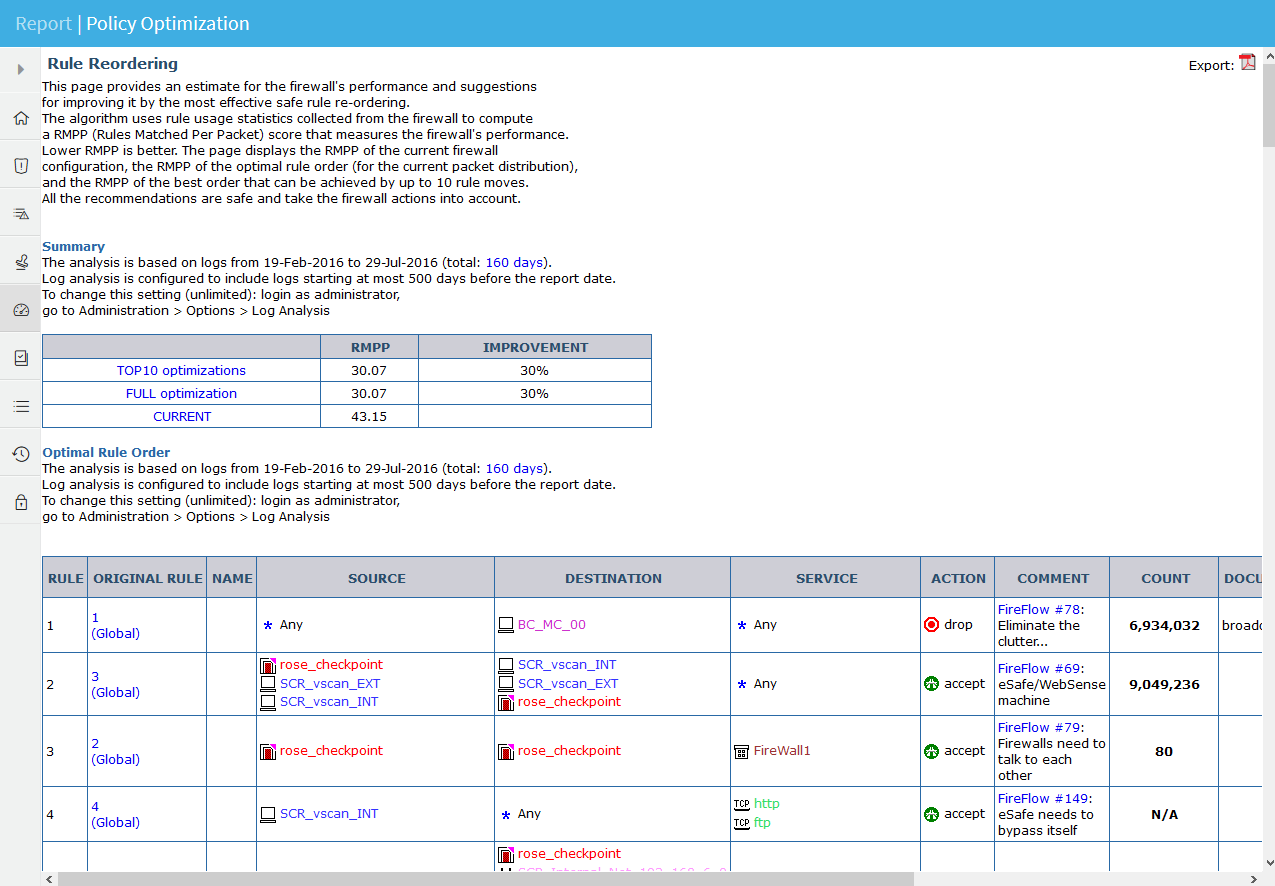 • Optimal Rule Order. Provides a complete list of all device rules, arranged in the optimal order for best performance based on RMPP.