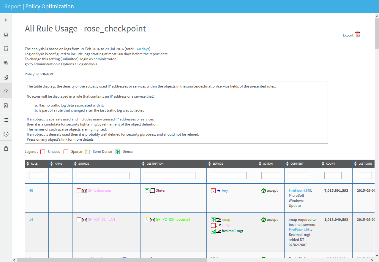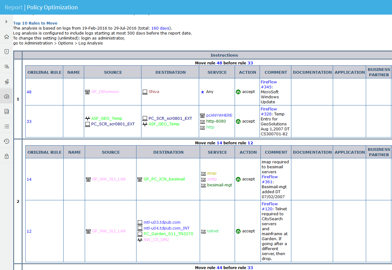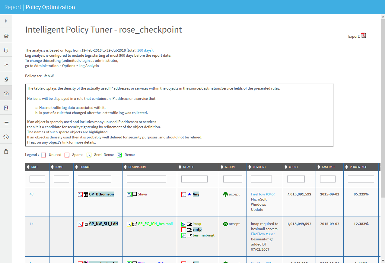 To optimize your policy, you need to find out which rules are redundant, unused or already covered by other, more general rules. These rules are prime candidates for removal from your device policy. In addition, you need to see the statistics on the most and least used rules of a policy: the device's performance may improve if highly used rules are placed near the top of the rule-set, and infrequently used rules are moved further down. In addition, you need to know about unused and empty host group definitions and unused access lists, because these unused definitions clutter up the configuration and reduce your ability to manage your devices effectively.
