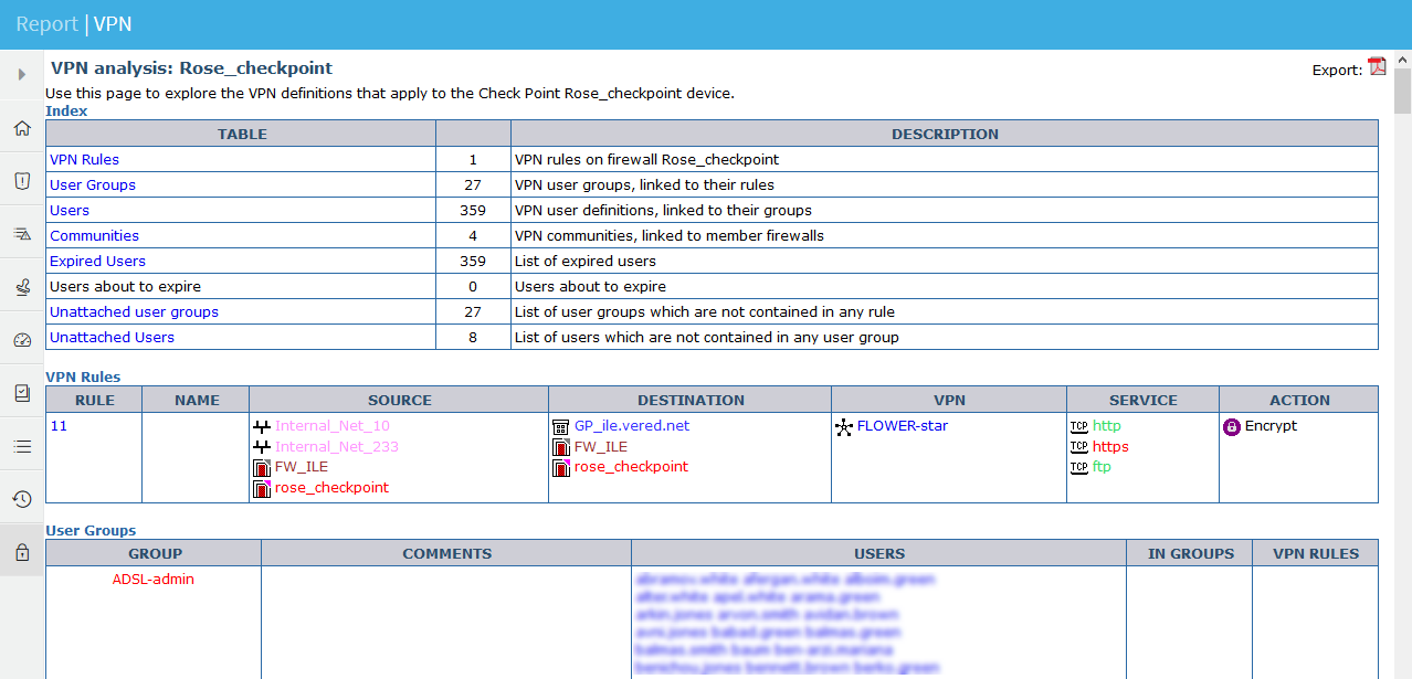 • VPN Rules: lists all the VPN rules found on the device, with links to the user groups that are in use.