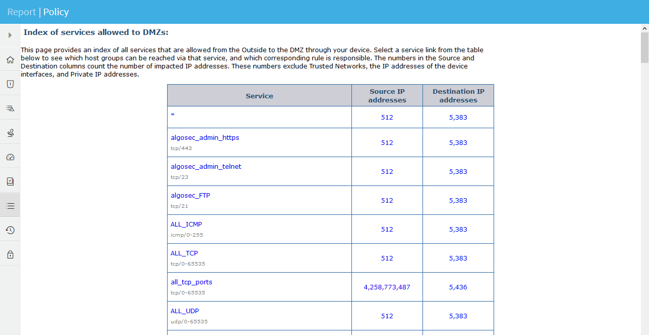 The values in the Source IP addresses and Destination IP addresses columns are the number of IP addresses impacted by the service, excluding Trusted Networks, the IP addresses of the device interfaces, and Private IP addresses.