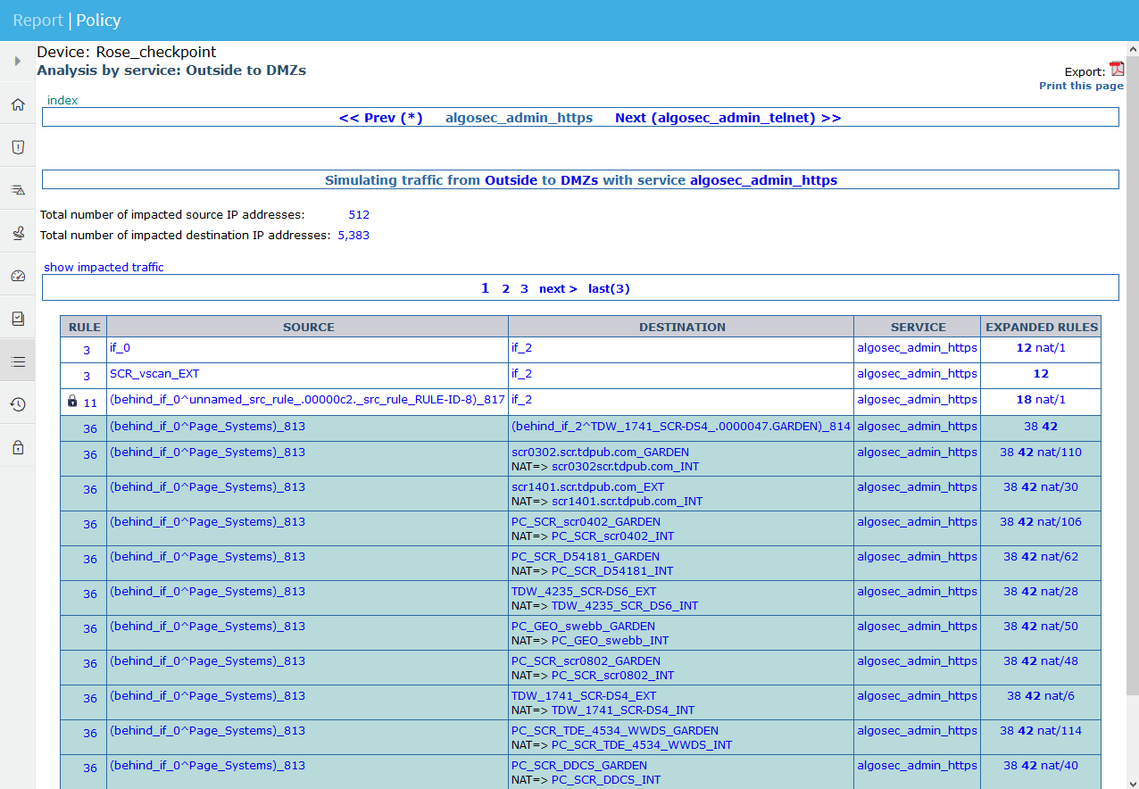 When you click on a link in the Rules Cleanup area all of the relevant rules appear. The columns which appear for each rule are specific to each device brand. If AppViz is licensed, fields from AppViz appear, indicating business information such as which rules are included as flows in which applications.