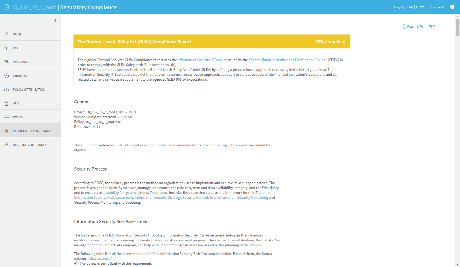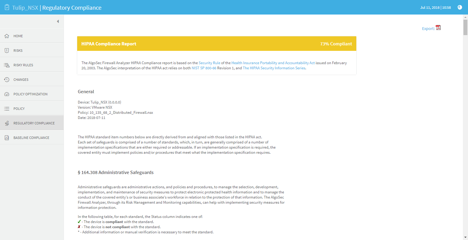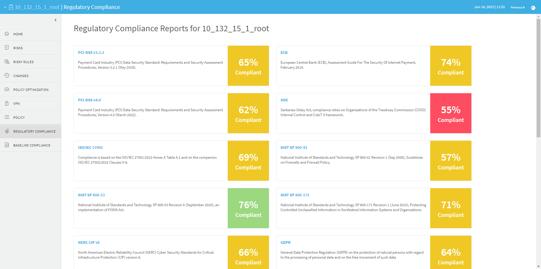 The REGULATORY COMPLIANCE page includes a number of reports that describe how compliant your security policy is to specific regulatory standards.