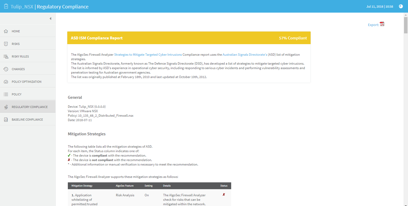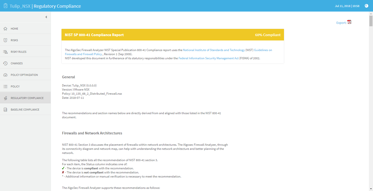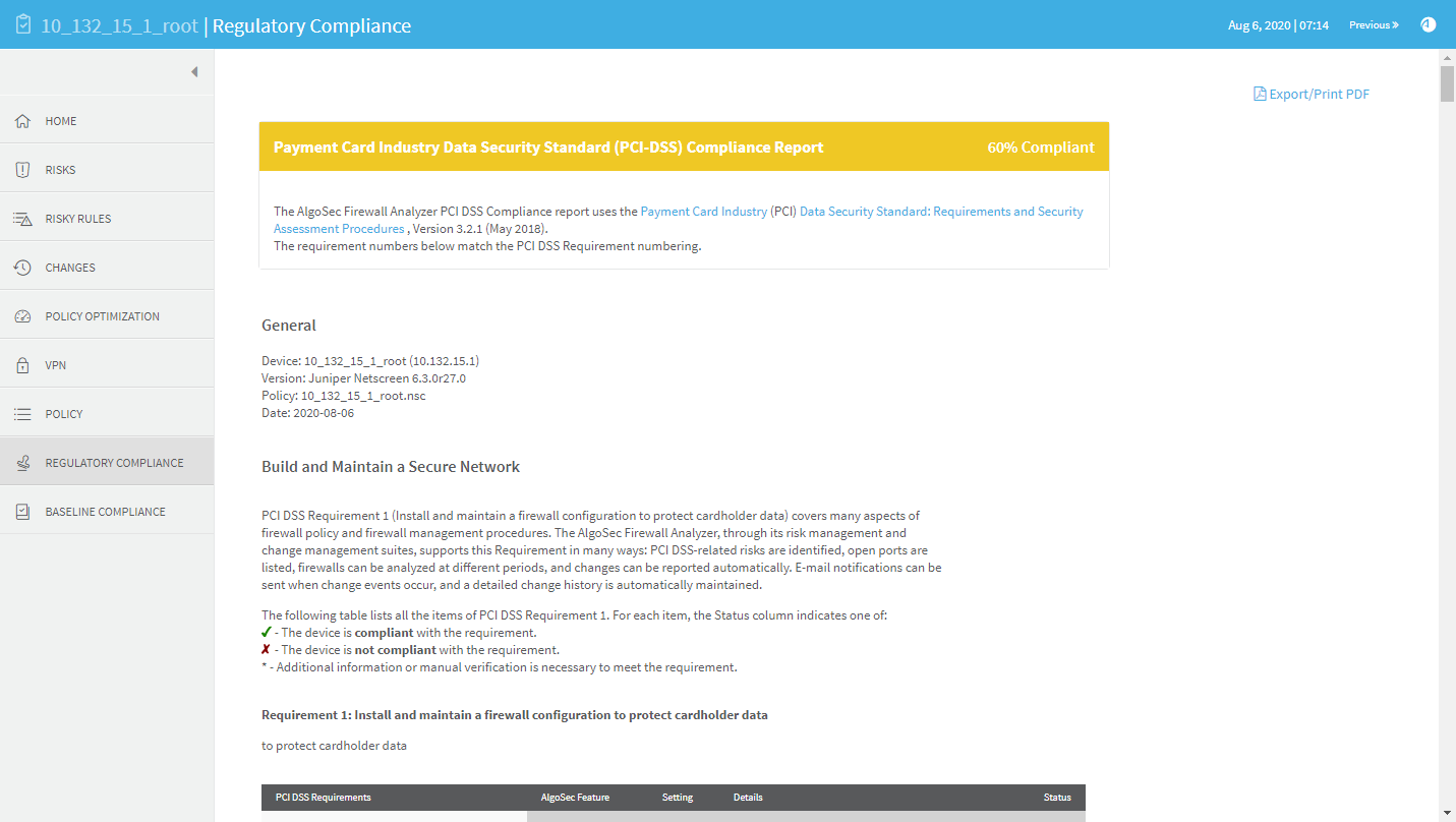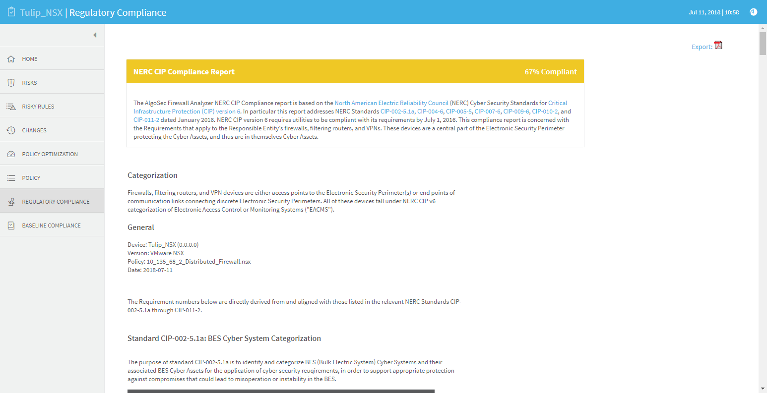 The REGULATORY COMPLIANCE page includes a number of reports that describe how compliant your security policy is to specific regulatory standards.