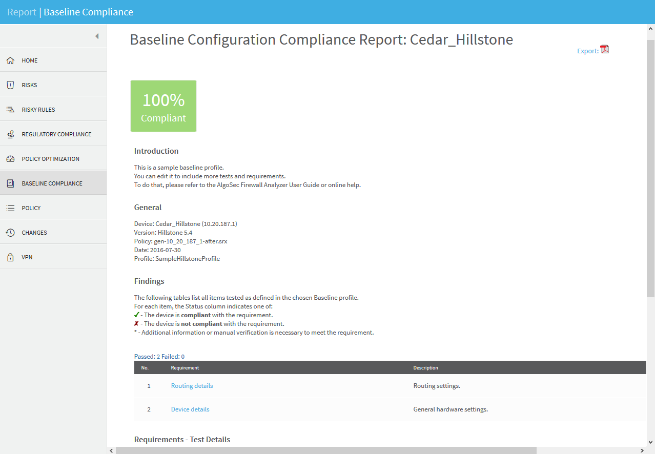 If a baseline compliance profile is specified for the device, the report will include the Baseline Compliance page. This report indicates whether running the commands specified in the baseline compliance profile on the device results in the output specified in the baseline compliance profile. If so, then the device is considered to be in compliance.
