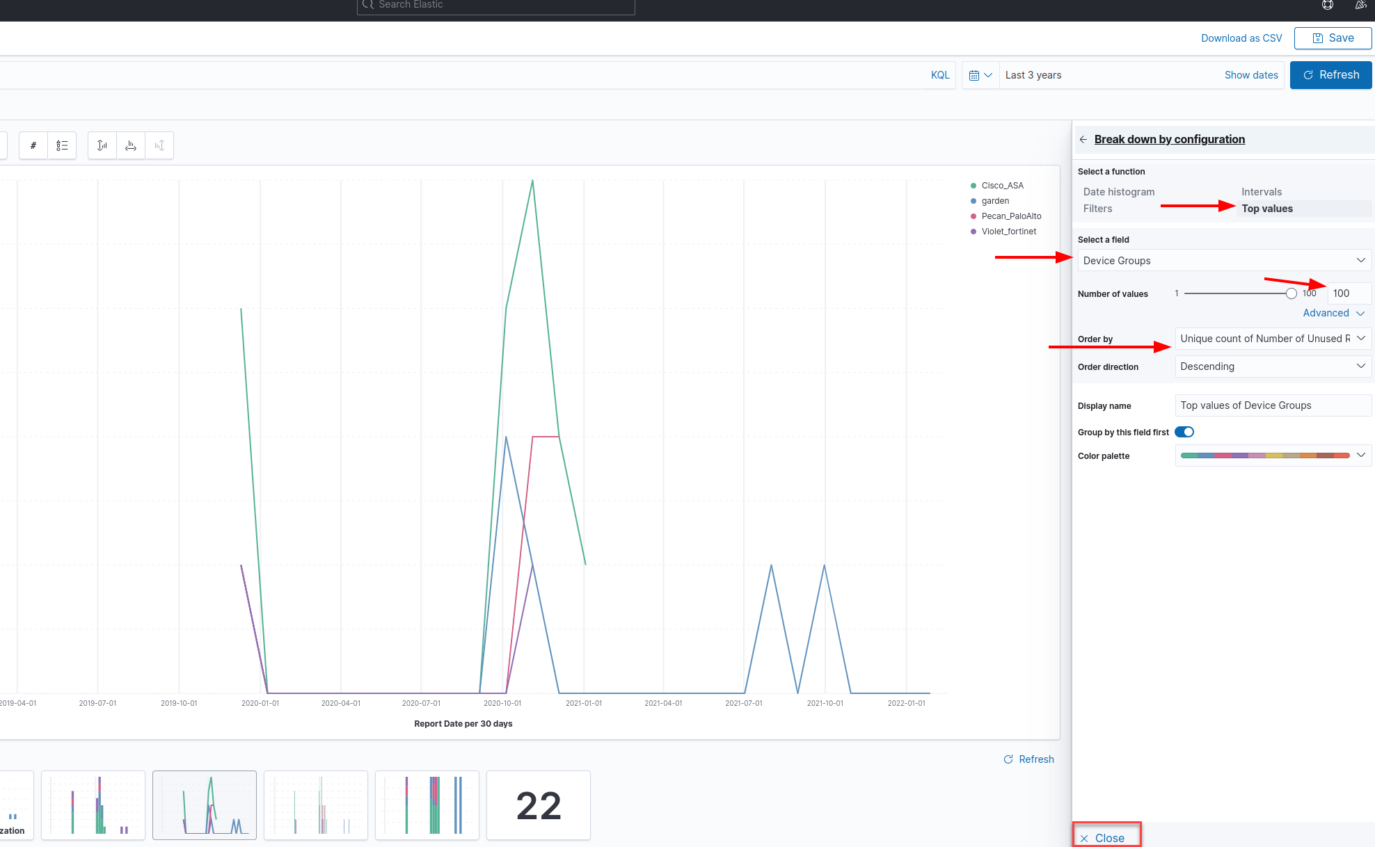 These steps demonstrate how to create a visualization of unused rules per device group along time.