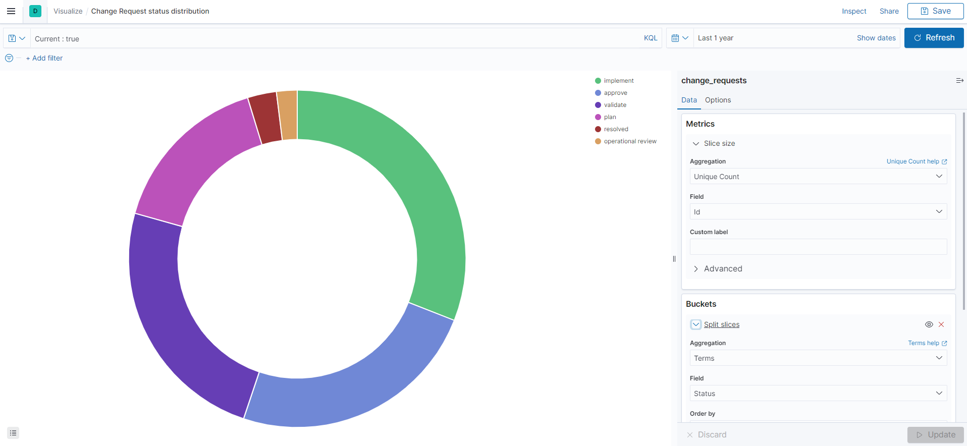 Continue by creating dashboards that include your charts. For details, see Visualize data straight from the Discover page, Visualize data, and Dashboards.