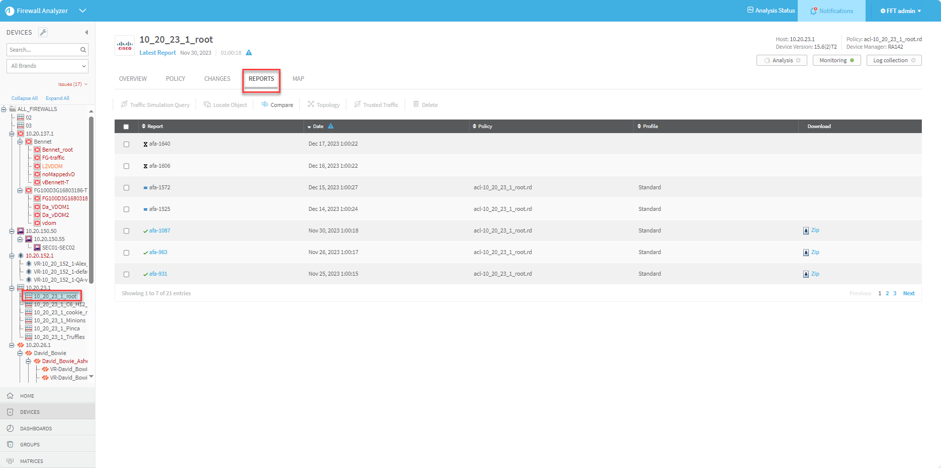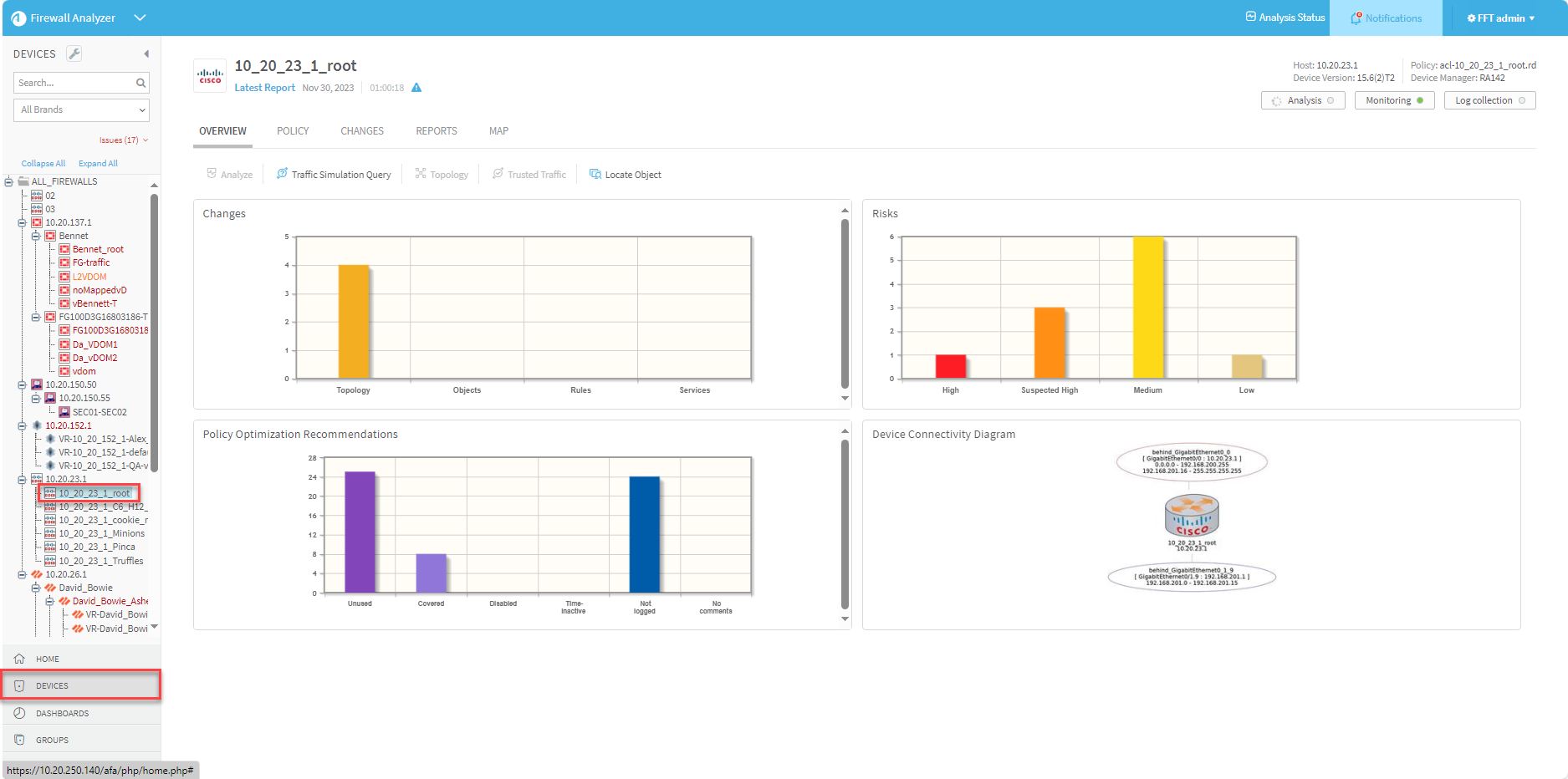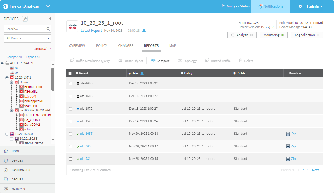 Changes. Displays the changes in rules, objects, and the resulting changes in allowed traffic and risks, over all the history of AFA reports for this device.
