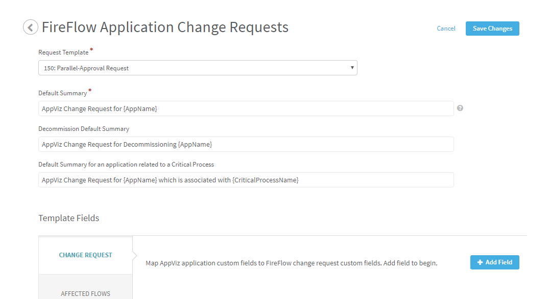 - (Optional) To map the values of AppViz fields to FireFlow change request custom fields, continue completing the fields as needed. For details, see Template fields .