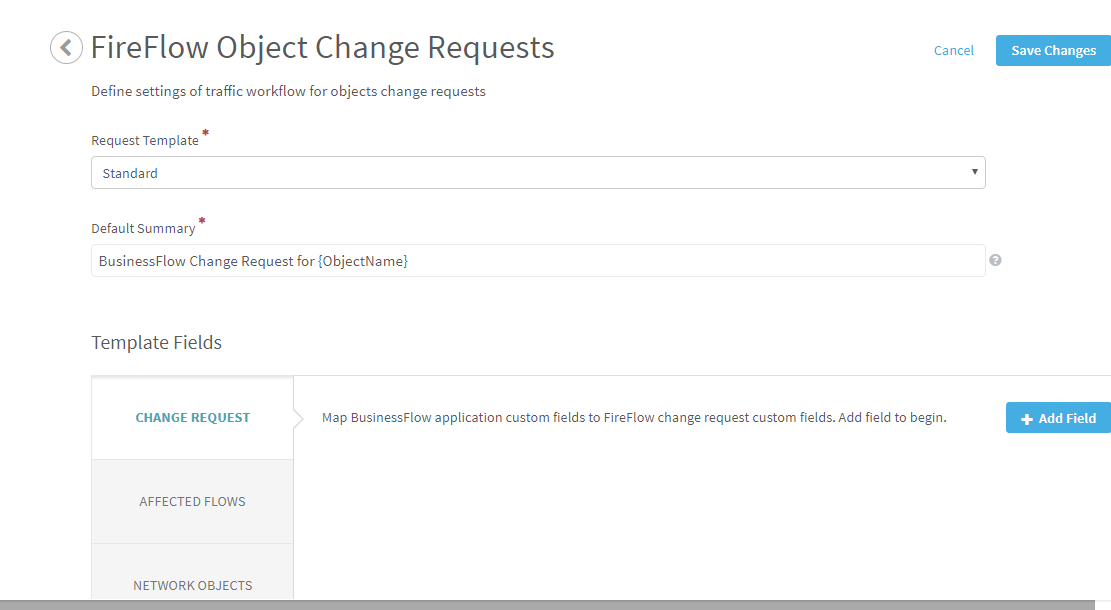 - In the Request Template drop-down menu, select the FireFlow traffic change request template to use for all object based change requests