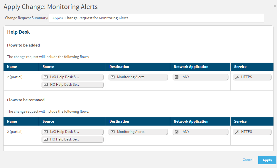 Flows to be added The change request will allow this traffic. Flows to be removed The change request will deny this traffic.