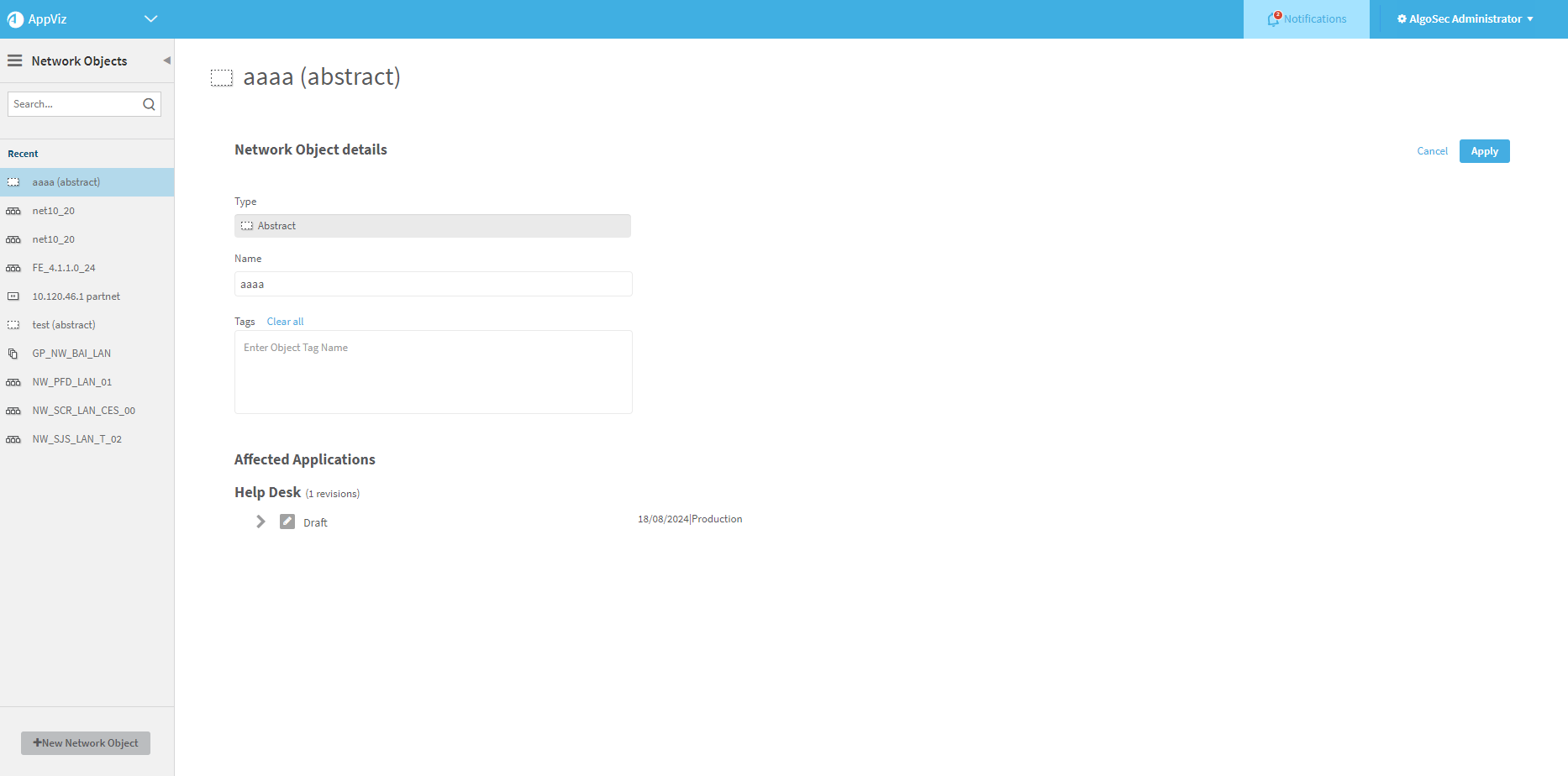 Note: The history of deleted network objects can be viewed in the activity logs. For details, see Network object activity logs.