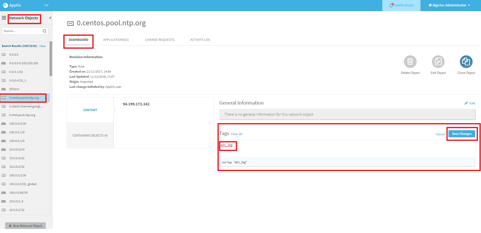 The network objects dashboard is displayed displaying the added tag.