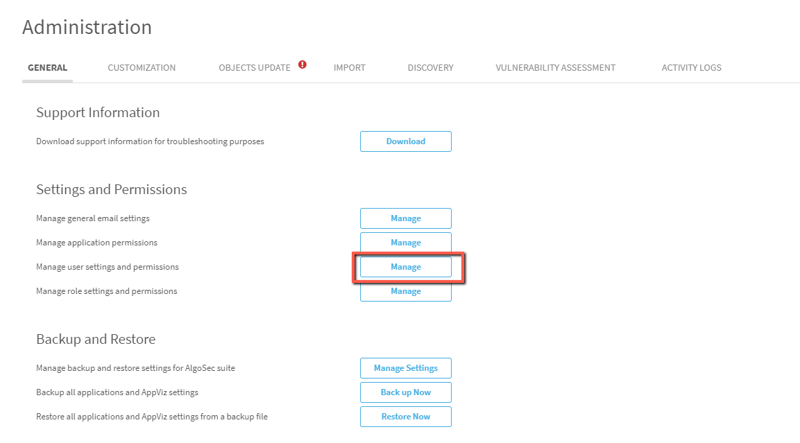 On the General tab presented, click the Manage button next to Manage User Settings and Permissions.